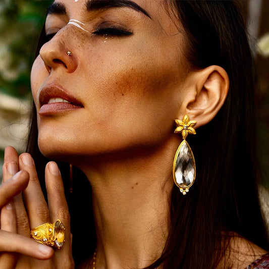 "Gypsy Rose" Dangle Hook Earrings (Quartz Crystal Beads, 18k Gold)