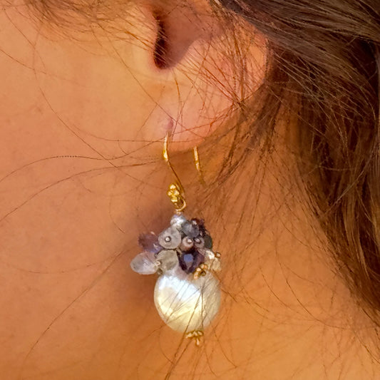 "Ben" Hook Earrings (Aubergine Freshwater Pearl, 18k, 22k Gold)