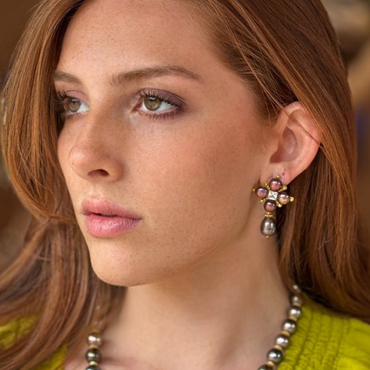 "Orvieto" Button Drop Earrings (Freshwater Pearl, White Zircon, 22k, 18k Gold)