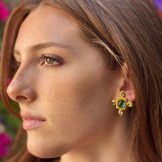 "Konstantin Cross' Stud Earrings (Green Tourmaline, Peridot, 22k Gold)