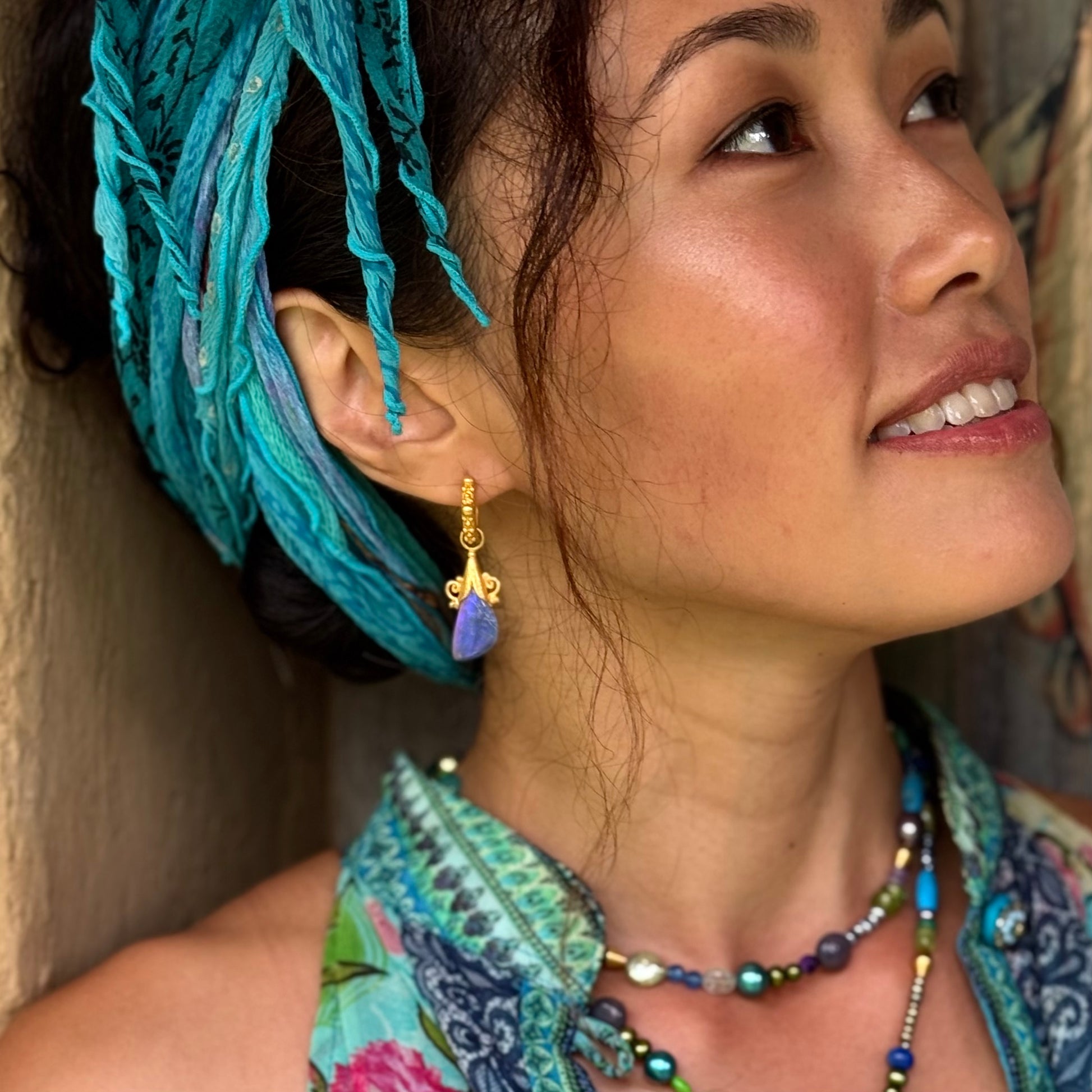 Our "Angela" hoop earring is our favorite go-to for everyday wear--they're so comfortable and secure, you'll wear them 24/7! We have two versions: this one has white sapphire accent stones, for a bit of bling, and we have an all-gold version (shown on model with our "Kilauea" opal drops). At 5/8", they're the perfect huggie-style small hoop to pair with our colorful earring charms, and an ideal jewelry-wardrobe foundational design to build on.