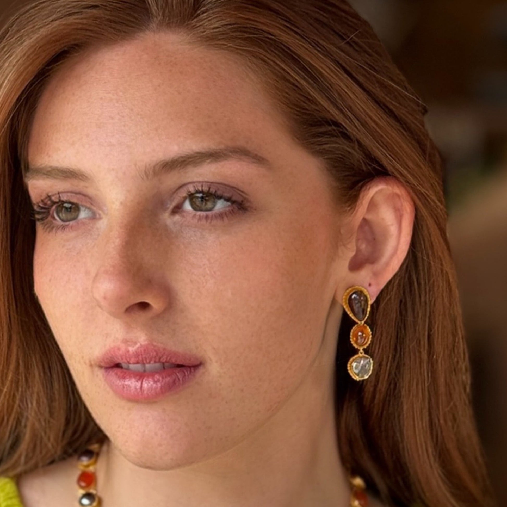 These "Autumn Fishnet" dangle earrings pair perfectly with our Autumn Fishnet bib necklace (but may be purchased separately). Highly lustrous Tahitian keshi pearls, fire agate, and hessonite garnets all with natural organic shapes, are encased in intricate 22K gold granulation settings. The versatile detachable dangle design features hooks on the back, allowing the earrings to transform into studs, making them perfect for daytime casual wear or evening elegance. Posts and earring backs are 18k for durability. Studs may accommodate other drops, like our Jezebel Tassels!