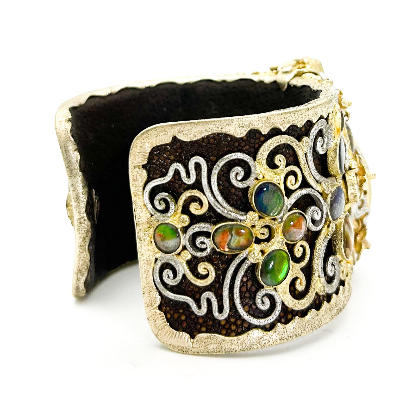 "Ammonita Arabesque" Bracelet (Ammolite, Sterling Silver, 22k Gold Vermeil, Leather)
