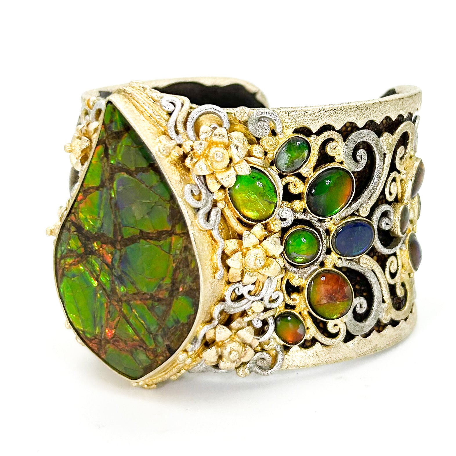 Step into a world where ancient history meets breathtaking luxury with the "Ammonita Arabesque" cuff bracelet— a one-of-a-kind masterpiece that captures the essence of 100 million years in every shimmering detail. Adorned with 76.5 carats of rare Canadian ammolite, this exquisite bracelet showcases the iridescent beauty of fossilized ammonite shell, transformed into jewel of unparalleled brilliance. Sourced from the ancient aragonite layers of these prehistoric ancestors of the chambered nautilus, ammolite’s vibrant, pearly hues dance with every movement—a true testament to geologic artistry.