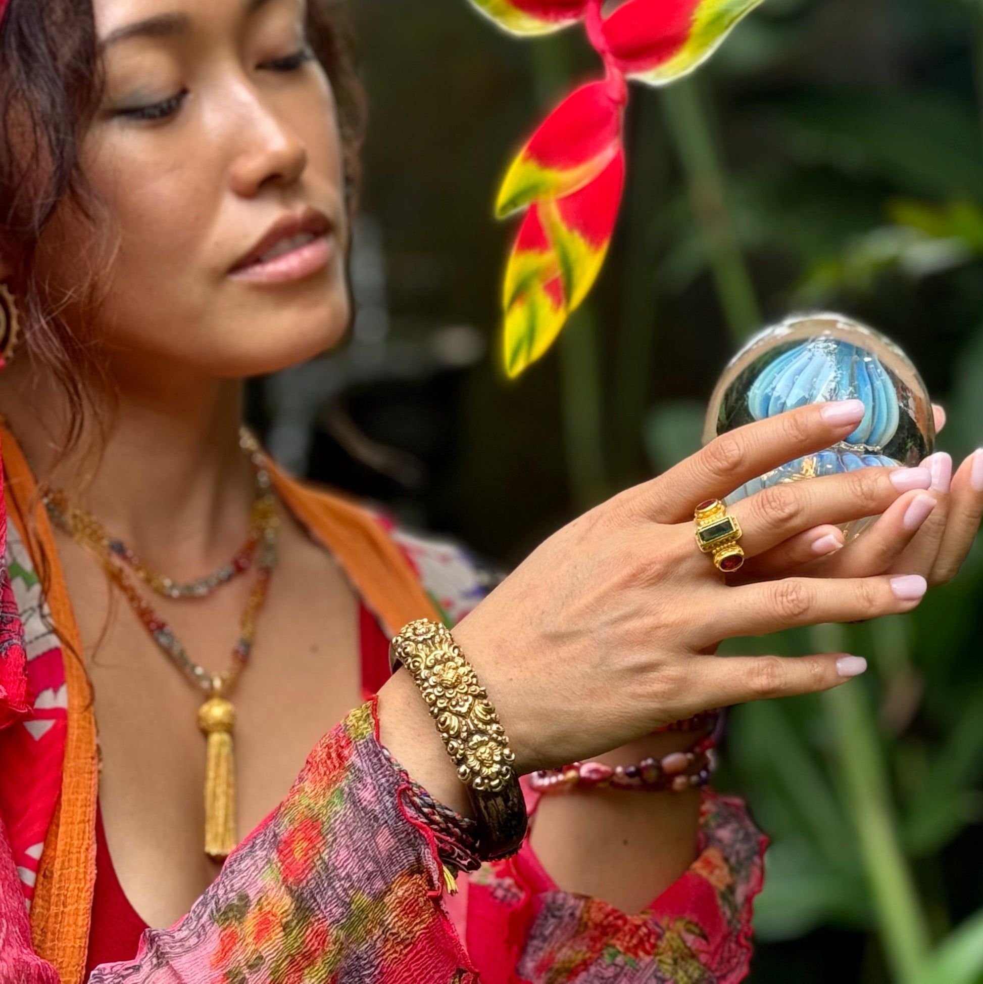 An updated take on an exotic Balinese antique design-- this "Tata Bali" bracelet is fashioned from thick black Indonesian coral that the designer found on a beach while on a scuba diving trip in the exotic "Coral Triangle". Using the traditional technique of heat-shaping, her favorite octogenarian goldsmith created this intricate repoussé (hammer-formed) design in 18k antiqued (darkened) gold, to highlight the rich traditional floral detail. Hinged with a lock mechanism, this is a stunning and unique find! One of a kind...