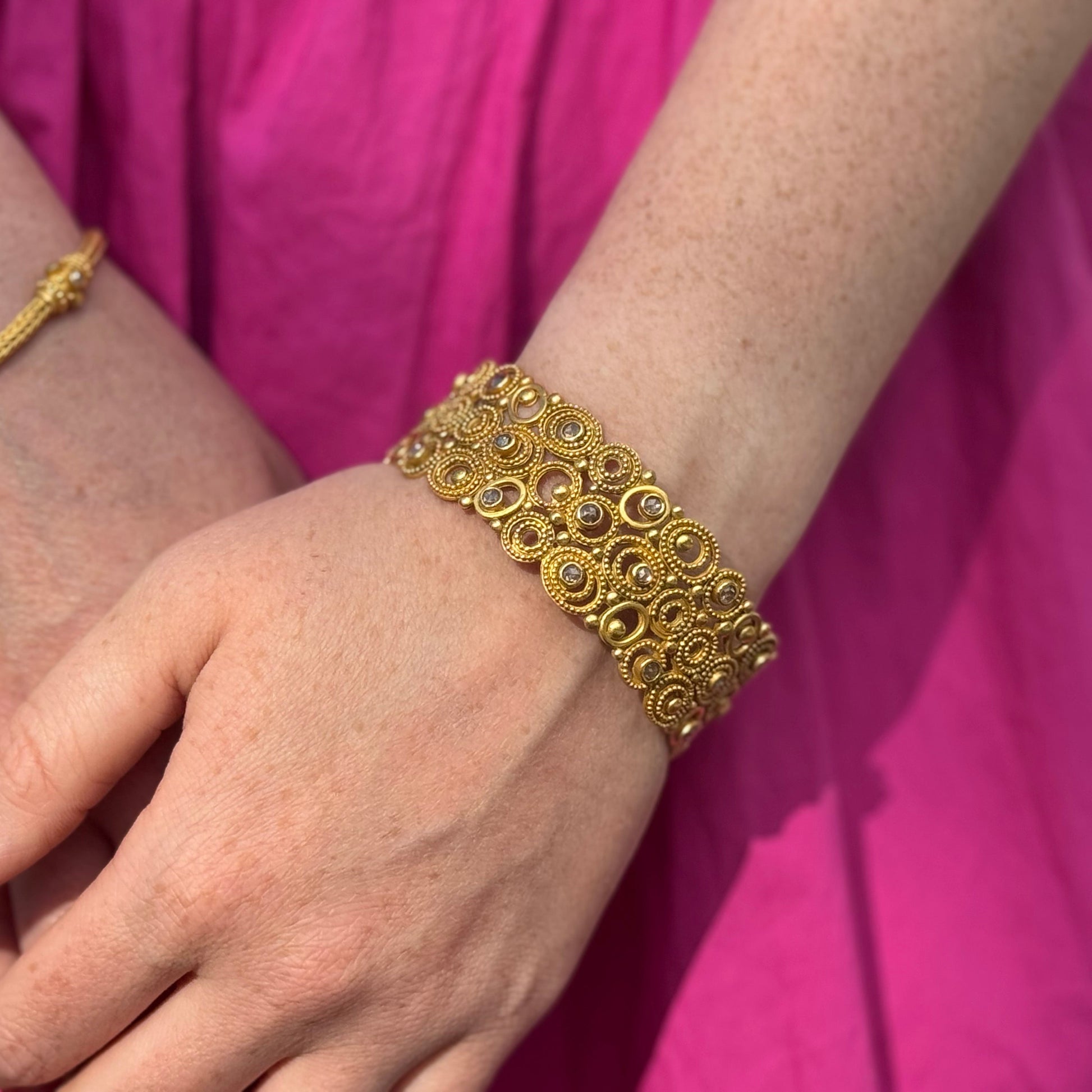 This 100% hand-fabricated "Dune" bangle style bracelet with its concentric circles and gold "bubbles" was inspired by the artist's love of water, and named after the first collector to order the design. Rendered in matte-finish 22k gold, this bracelet displays meticulous cutwork and granulation detail, 100% hand-fabricated by our Balinese master gold smiths (shown on model with rose-cut diamonds). Inner circumference: 8". Make this bespoke treasure a stunning addition to your bangle collection!