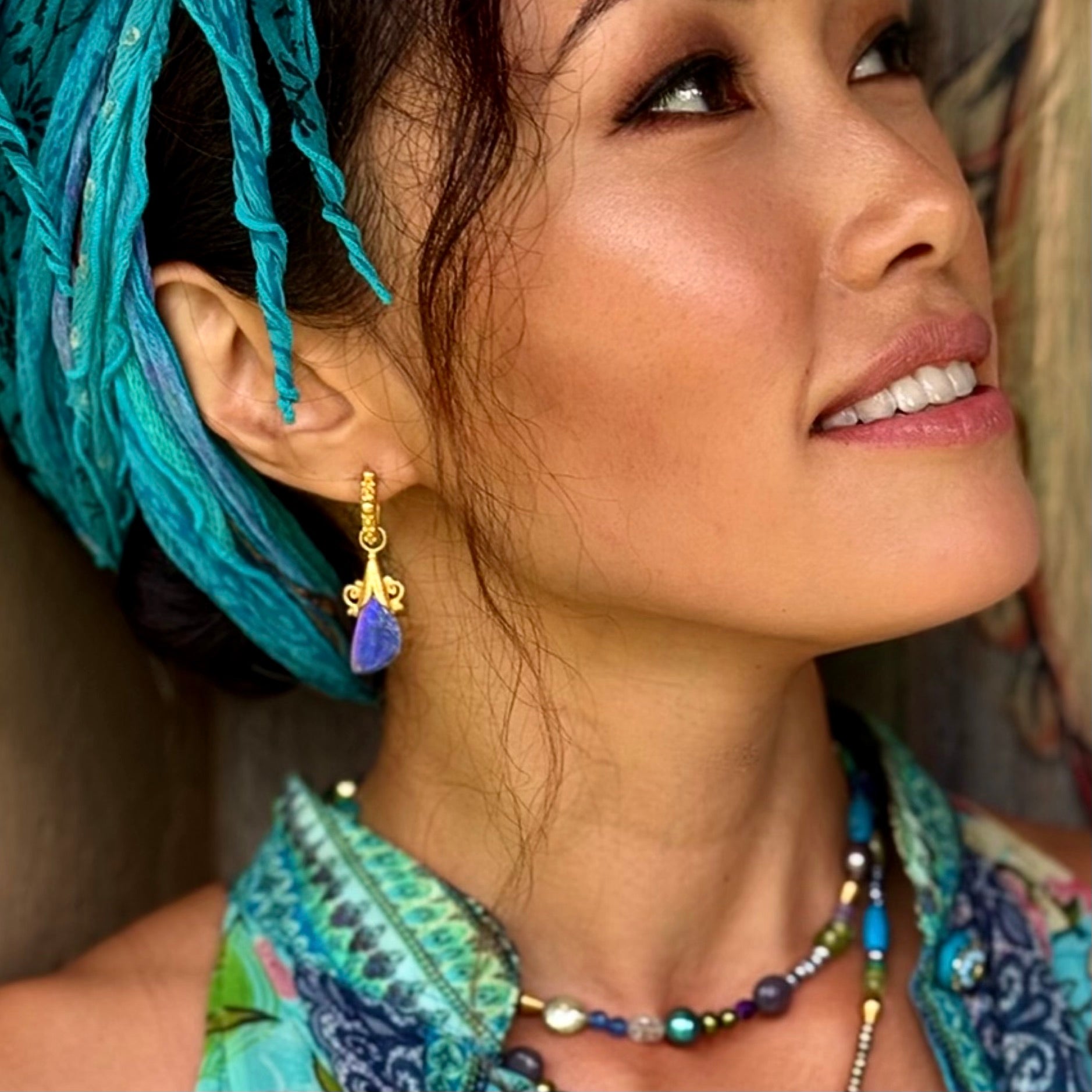 Our ever-popular "Angela" huggie is everyone's favorite go-to small hoop earring. It's compact and lightweight enough to wear 24/7, but substantial enough to make a solo statement, because of the incredible hand-detailing in buttery yellow 22k gold. It's versatile when paired with our many colorful drops (shown on models), and it has an 18k curved post which locks-in for durability and security. It also comes in oxidized sterling silver and gold combination for those into an edgier (and more affordable) look (shown below). This is a great "jewelry wardrobe" foundation piece to build on!