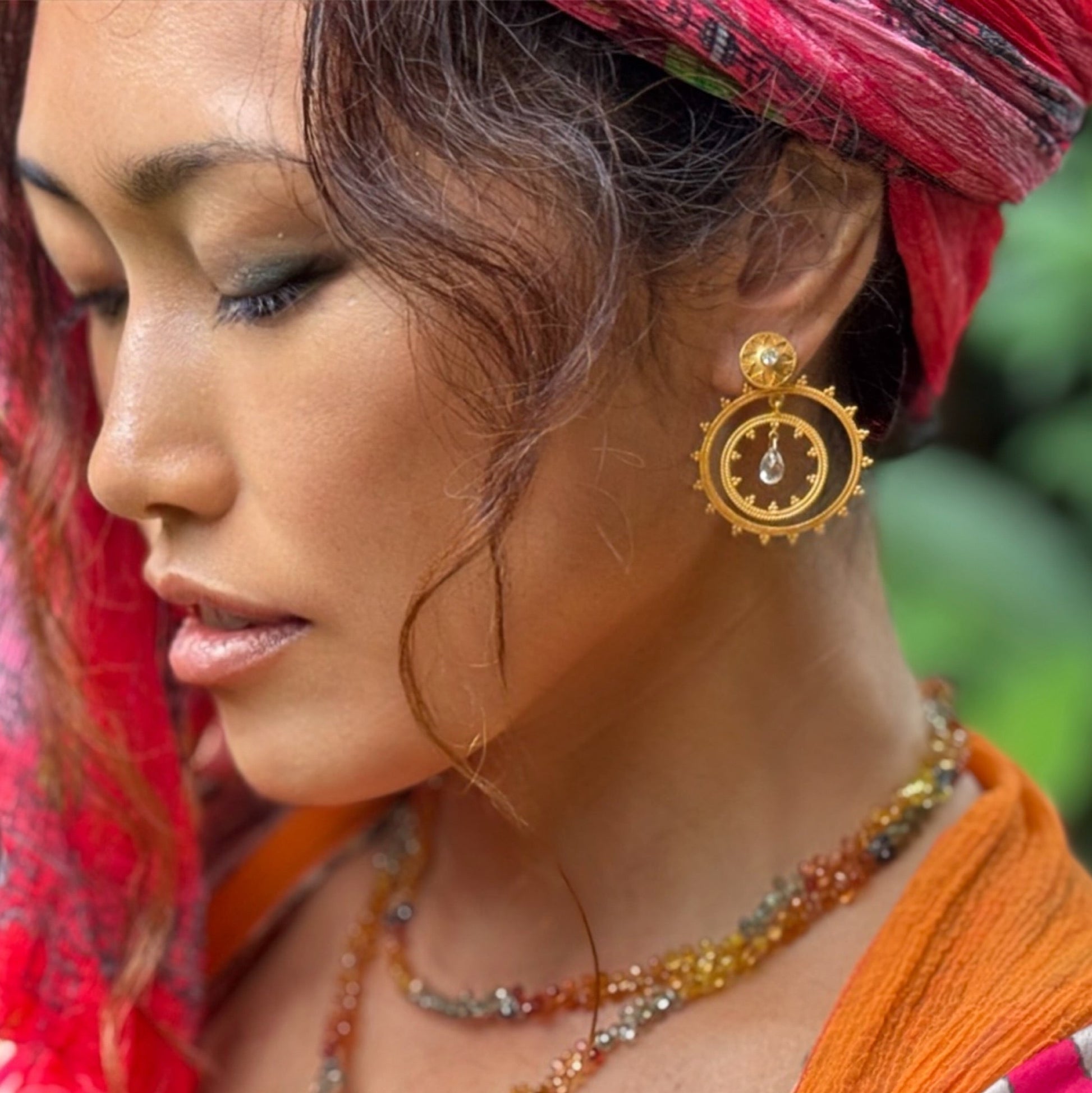 Our versatile and very wearable "Dreamer" earrings combine a stud and a hoop-shaped dangle featuring 4 carats of brilliant Cambodian zircon briolette dangles and faceted rounds center stones in the studs. These ingenious 22k matte yellow gold earrings are ideal for travel, since they can be worn as casual studs, with the dangles, and the dangles can be used with a plain ear wire, or on our "Honey Flower" hooks. 100% hand-fabricated, with intricate granulation detail. One-of-a-kind, and our only pair! 1.25” diameter.