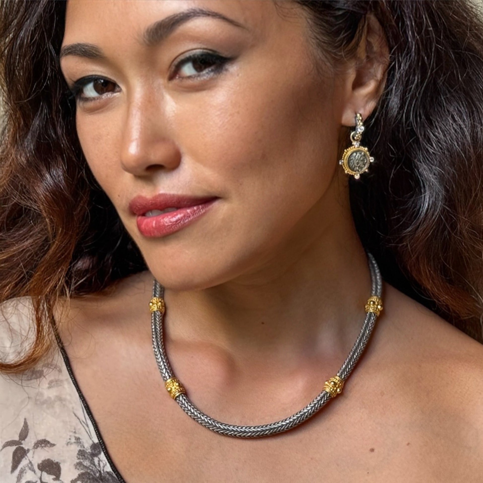 Our popular "Etrusca" chain necklace was inspired by Greco-Roman archaeological jewelry, using a distinctive loop-in-loop weave. Featuring masterfully crafted 22K matte-finish gold stations with fine granulation detail, at 9mm thick and 18" long in mixed white and yellow metals, it's ideal for men and women alike. Hand-fabricated 925 sterling silver chain, and an 18K gold "invisible" locking box clasp keeps this treasure secure. Pairs beautifully with our ancient silver coin pendants, for ancient history-lovers! This is one of our last two in stock, but necklace and bracelet versions may be ordered in different lengths and thicknesses (prices commensurate).