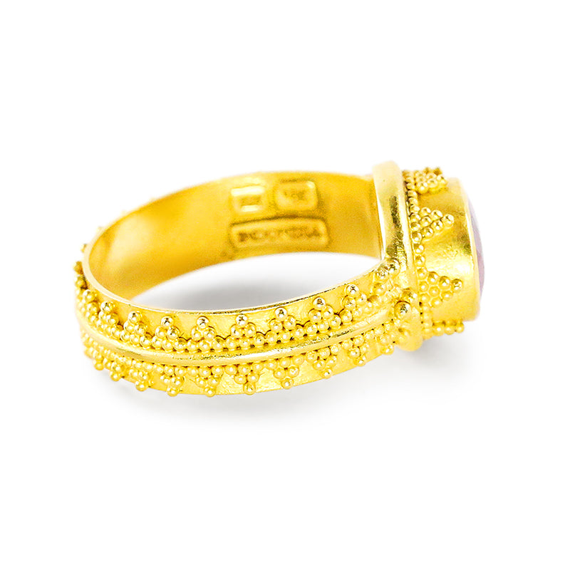 Get in the pink with this flashy 2.08 carat rubellite tourmaline checkerboard-cut "Fancy Sparkler" ring! A gorgeous fuchsia oval faceted gem, set east/west, is the mesmerizing focal point for this feminine 22k matte yellow gold ring design featuring fine, hand-done granulation detailing. Rubellite tourmaline is one of the birthstones for October/Libra. This one's a US size 7 (re-sizing not recommended, but we can custom make in any gemstone choice). Our "Fancy Sparklers" make a great casual-wear ring design, and many have ordered this style as a wedding ring!