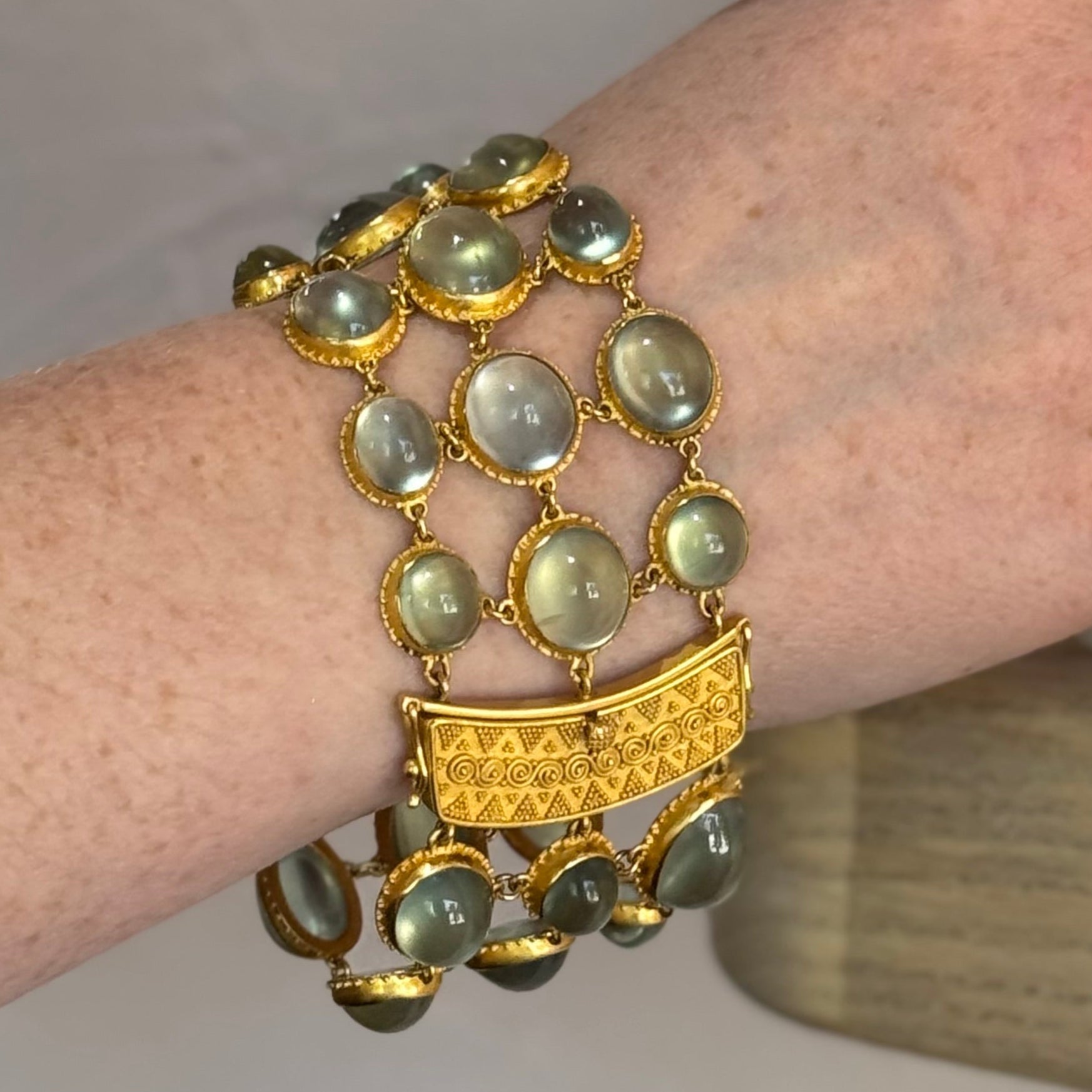 This show-stopper "Misty Spring Fishnet" bracelet is meticulously crafted to create a fluid mosaic of 206 carats of glowing Spring-green Australian prehnite cabochons. Each oval-shaped gem is set in 22k gold with intricate granulation around the linked bezels, adding texture and slinkiness to this Art Nouveau-inspired design. The granulated box clasp adds a touch of wow! 7" in length.
