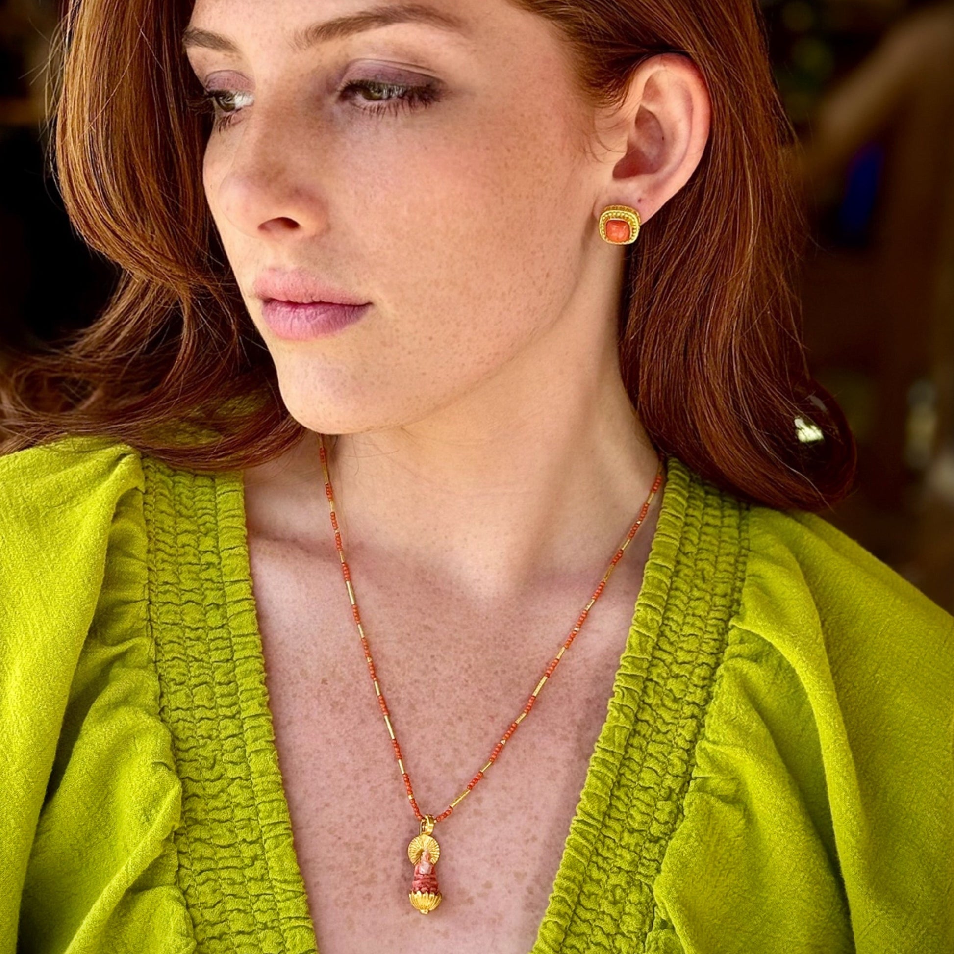 Part of our spiritual/talismanic charms collection, the "Lord Buddha" pendant showcases a sensitively carved 8.75 carat medium orange Italian coral gem Buddha, supported by a 22k lotus seat and crowned with halo of radiantly-etched gold (approx. .5" x 1.25"). The 18k hinged clasp allows for a chain, cord, or beaded necklace of up to 3.5mm in diameter. This one would complement any of our delicate necklaces featuring Mediterranean red coral. Symbolizing transformation and joy, coral has long been used as a protective talisman across many cultures from Tibet to the Middle East, making it a fabulous choice for travel and every day wear.