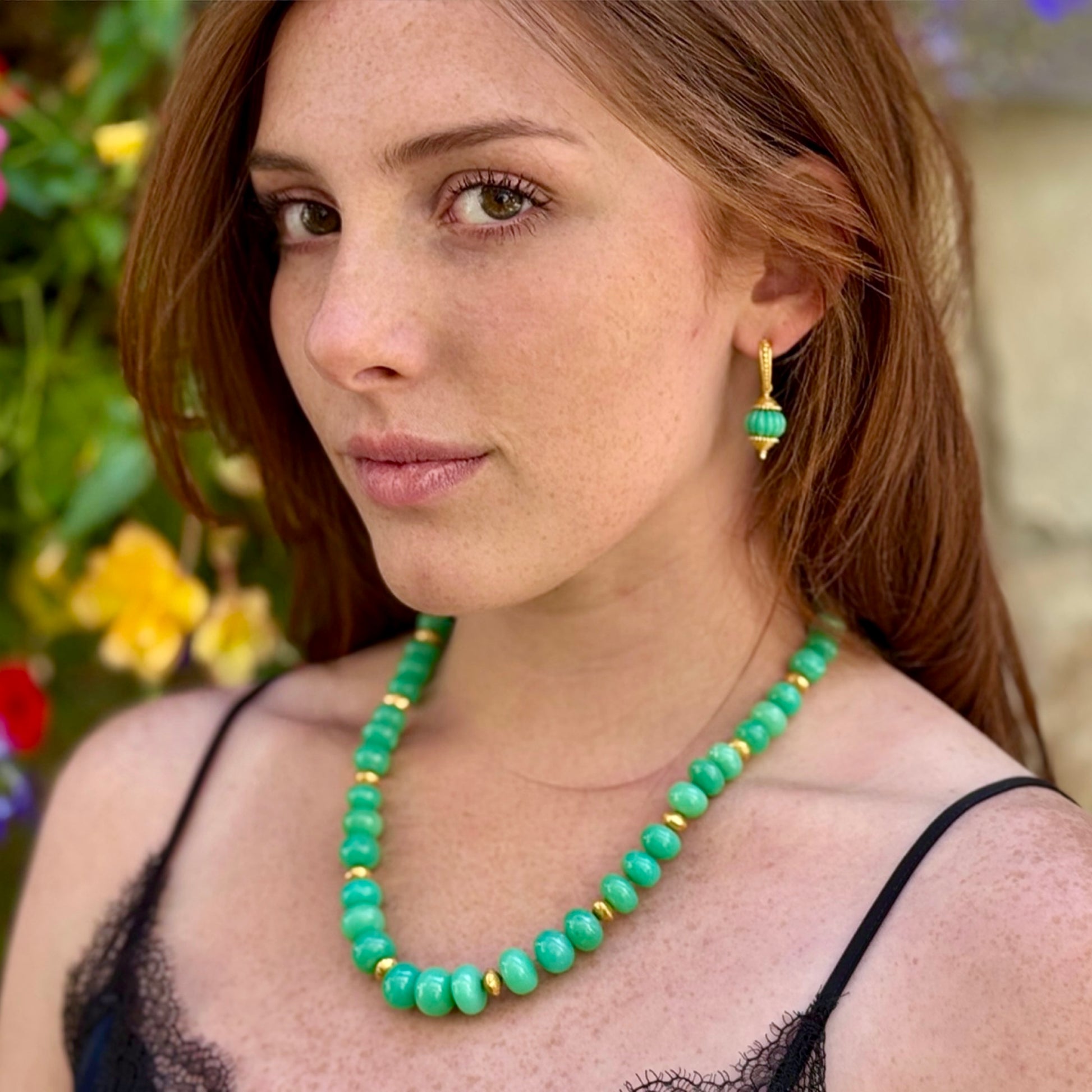 Dive into serene elegance with the "Lola Cancun" necklace-- a 21” vision of tranquility. Rare rondelle cabochon chrysoprase beads, glowing with soft sea-green hues, are interspersed with handcrafted 22k gold beads for a touch of luxury. The 18K toggle clasp secures this piece with casual chic. Inspired by the hues of Cancun’s tropical waters, this necklace brings a breezy sophistication to your collection for everyday wear.