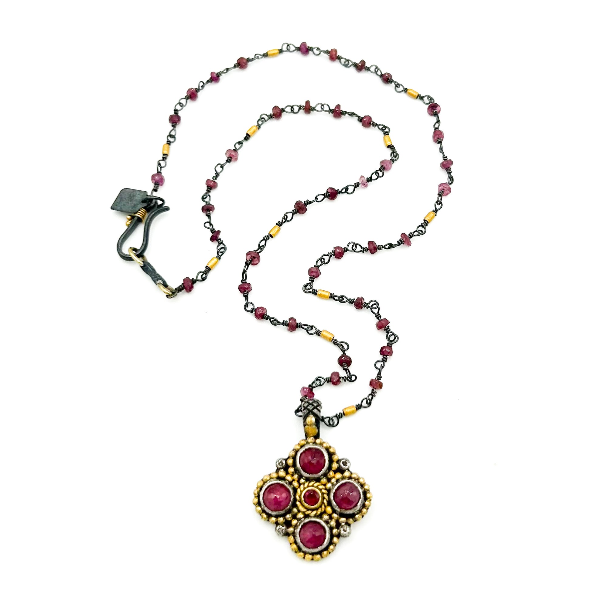 Our "Mini Maltese" cruciform pendant, hand-fabricated in a casual blend of oxidized (blackened) sterling silver contrasting with 18k gold is the perfect petite charm for delicate beaded necklaces and mixed-metal chains (our Pattya chain, shown). Graced with 2.4 carats of rose cut rubies, this versatile piece has a Bohemian vibe, great for everyday wear. A hinged clasp fits over chains and cords up to 4mm in diameter, overall size: 1" x 1.25". This also comes in moonstone cabochon and faceted blue sapphire.