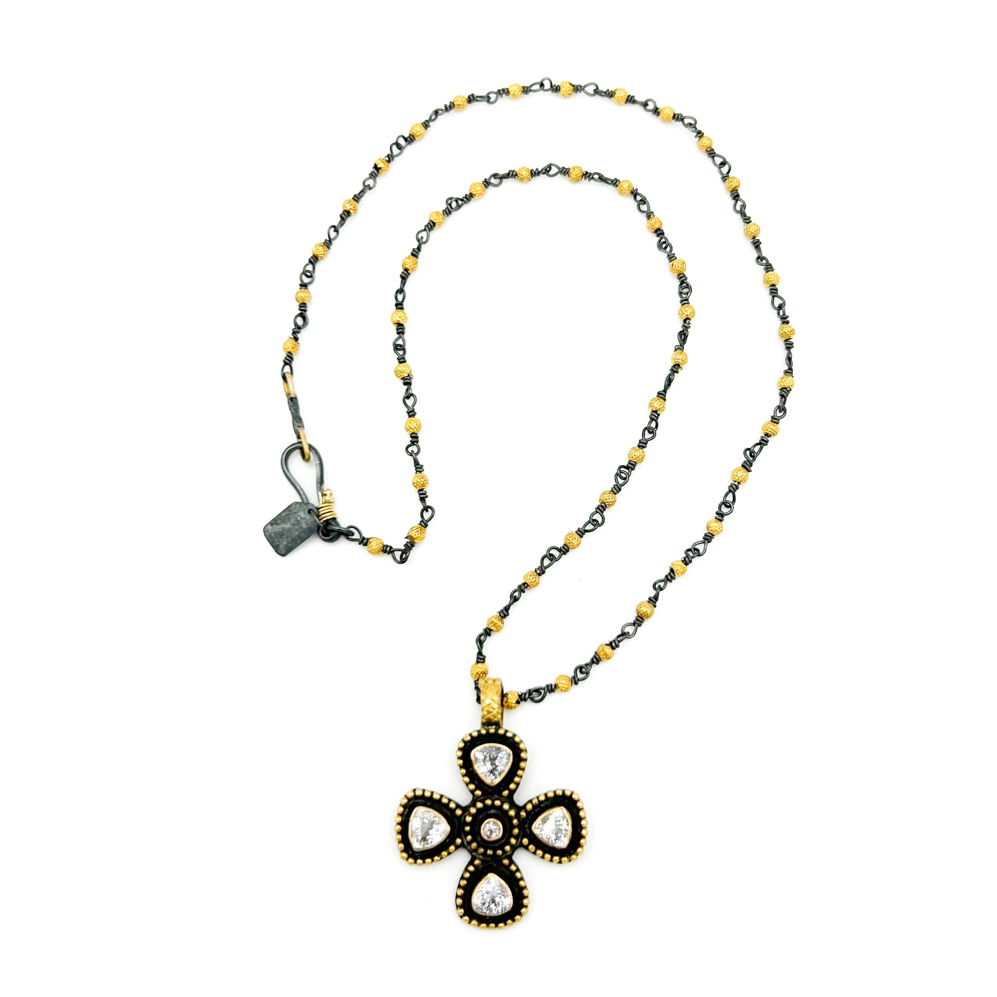 Our "Mini Malta" cruciform pendant, hand-fabricated in a casual blend of oxidized (blackened) sterling silver contrasting with 18k yellow gold is the perfect petite charm for delicate beaded necklaces and mixed-metal chains (our Pattya chain, shown). Graced with 2.7 carats of trillion and round-cut faceted white natural zircon*, this versatile piece has a Bohemian vibe, great for every day wear. A hinged, locking clasp fits over chains, beads, and cords up to 5mm in diameter. Dimensions: Approximately 1.25" x 1". This is our only one in white zircon, but we have blue sapphire, ruby, and aqua-colored apatite as well. May be custom-ordered in other gemstones.