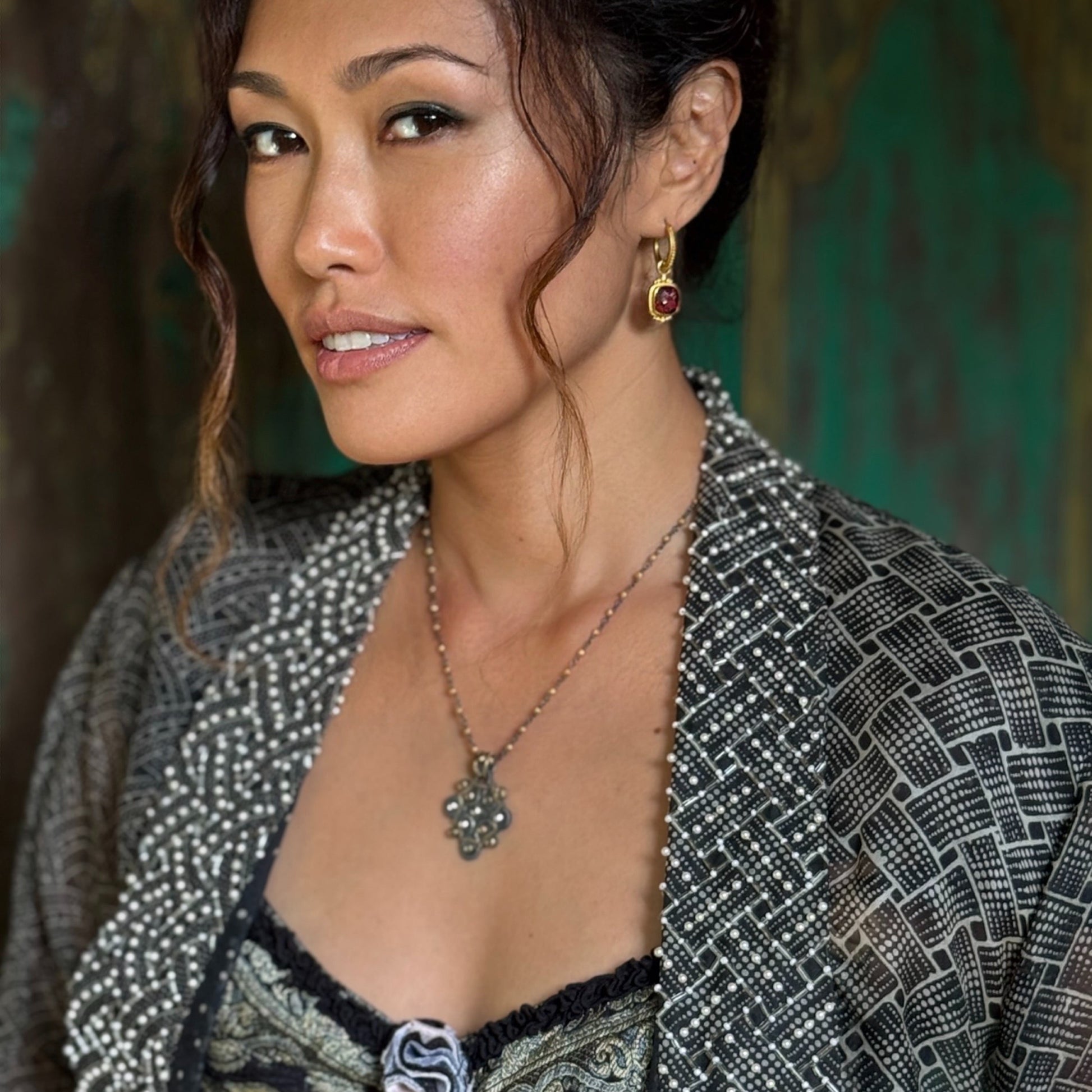 Our "Budapest" mixed-metal gem-set pendant brings bohemian style to any ensemble. Handcrafted with 1.05 carats of sparkling champagne rose-cut diamonds, this gothic-inspired piece blends oxidized sterling silver with luxurious 18k yellow gold etched details. Its intricate, handcrafted design Old World craftsmanship and bold sophistication—perfect for those who dare to stand out. This 1.5" x 1" piece pairs well with our mixed-metal necklaces ("Pattya" chain, shown on model). The bail accepts chains up to 3.5cm at the widest point--it does not open with a hinge)This is a one-off but it may be custom-ordered in many other gemstones.