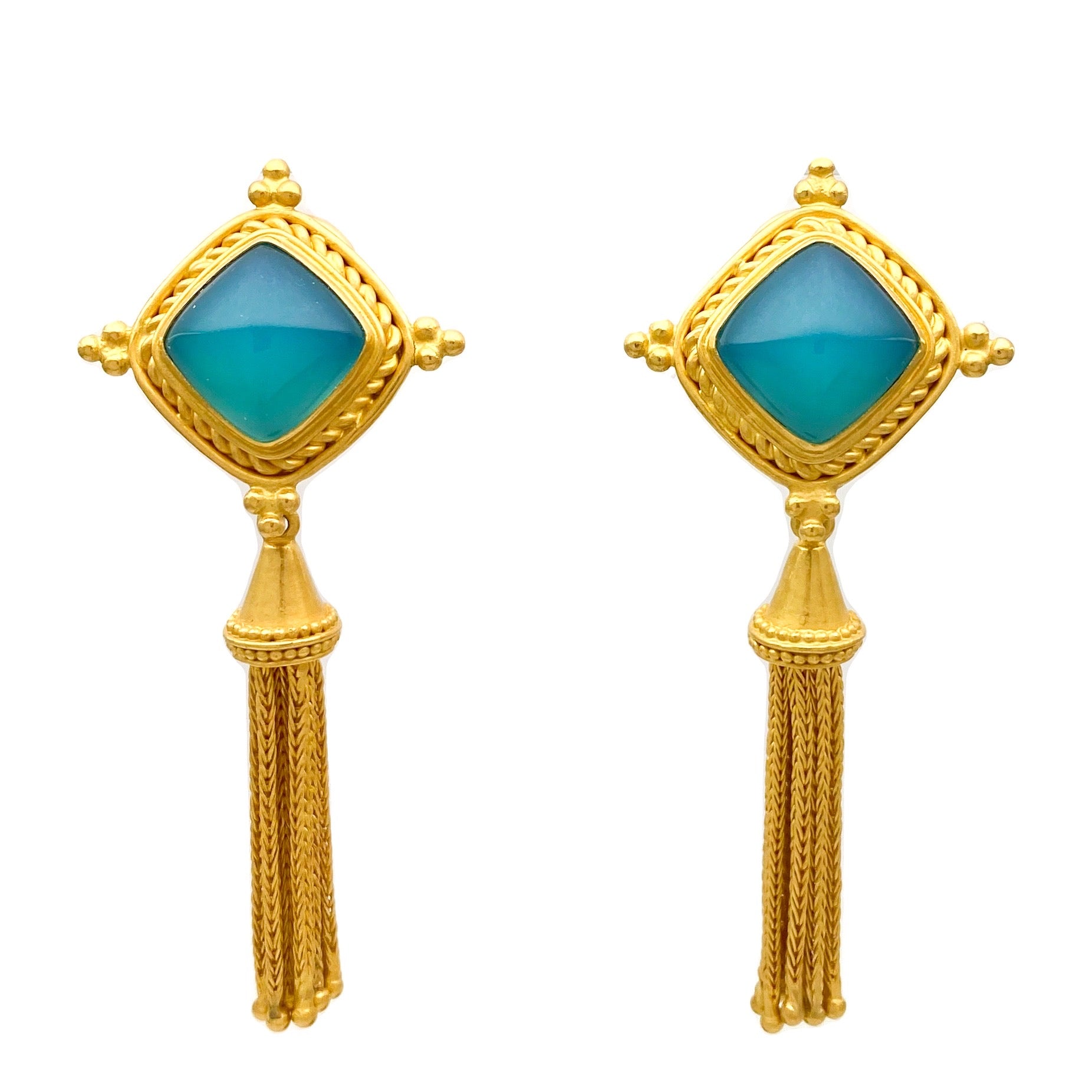 These "Idar" button stud earrings featuring 26.14 carat blue-green sugarloaf-shaped agate gemstone cabochons, are set in hand-fabricated 22k gold twisted wire frames with granulation details. The generous Omega backs provide a secure and comfortable fit, and can be adapted as clip-ons for non-pierced ears. Hidden hooks on the back offer the option to customize your look by adding drops, giving you elegant but casual versatility for any occasion. These look especially luscious with our Jezebel 22k gold tassel drops (shown on model) or white pearls (sold separately)!