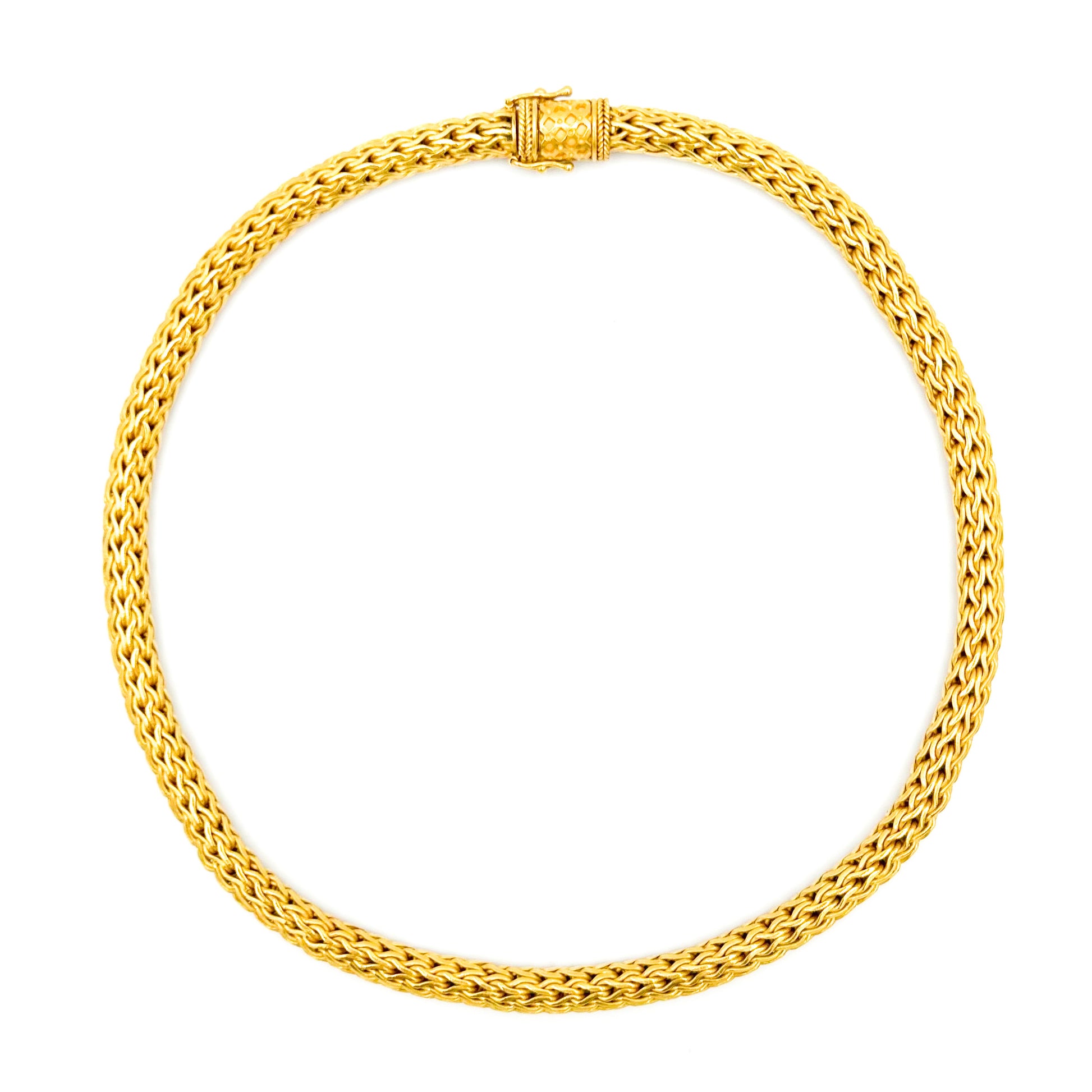 This hand-fabricated 17" chain is a masterpiece of timeless style, which took over 3 months to make. Featuring a weave design as old as the Sumerian culture, it makes a statement of everlasting chic. We've put a modern spin on this herringbone pattern by making it into a collarbone-hugging slinky oval shape, rather than round (5 x 6.5mm thick). The warm tone of the matte-finish 18k yellow gold, combined with the fluid drape of the expertly crafted smooth-texture chain adds irresistible allure to this bespoke necklace. Secured with a stylish ornamented box clasp with locking safety clip, this is our only "Lattice" chain, so if you love it, make your move now! Pairs beautifully with our all-gold cuff earrings ("Neptune" shown on model), for a casually elegant day-to-night look.