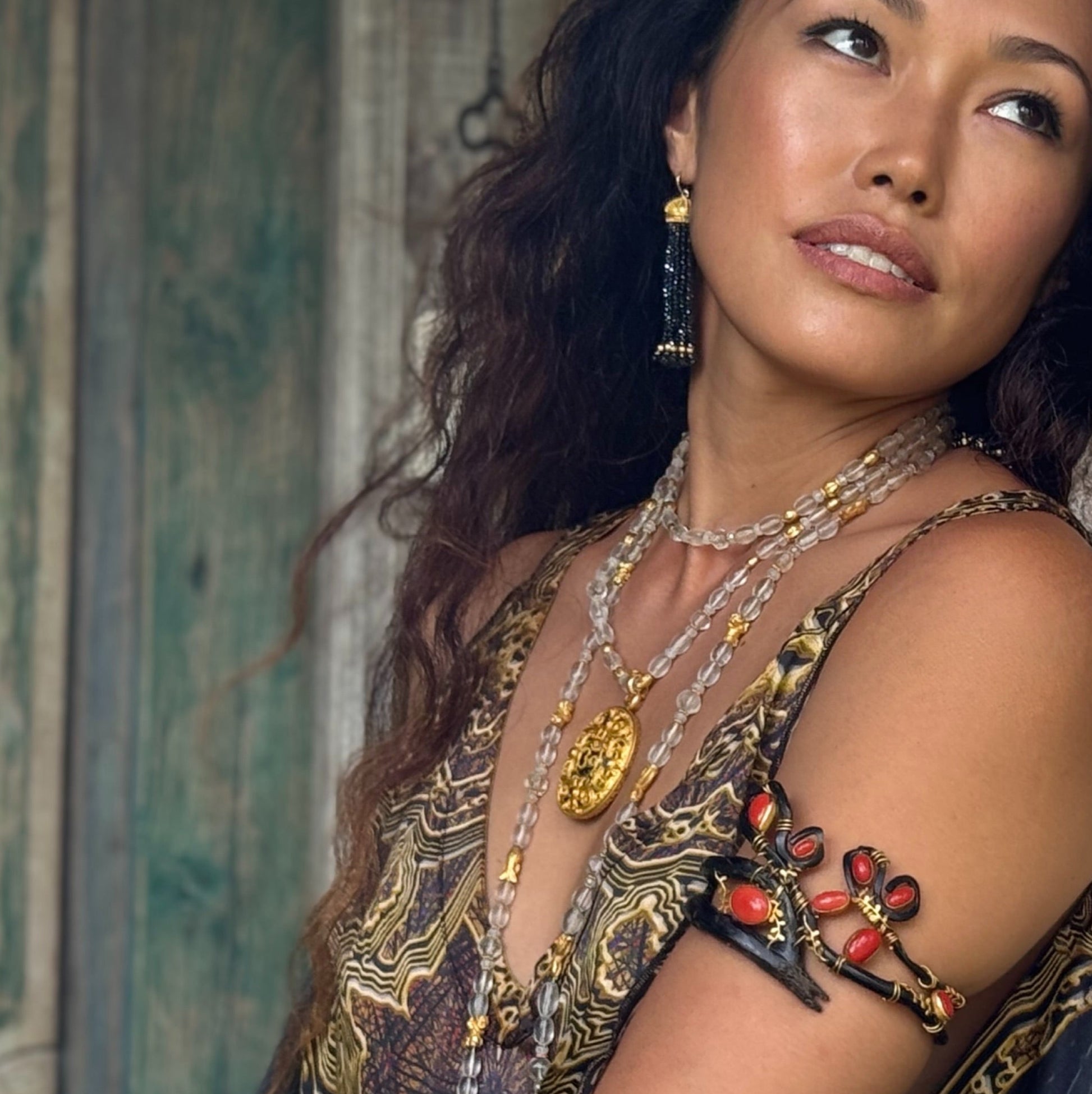 This "Long Lola" necklace brings crystal charisma with 33.5 inches of antique quartz beads in fluted and cylindrical shapes. Interspersed with hand-made 22k beads, this opera-length necklace can be layered, or adapted for use as a belly-chain, wrap bracelet, or doubled to wear as a shorter necklace (shown on models). Pair with our crystal "Susie Lingam" pendant, or "Tradisi" tassel. 18K toggle clasp enables convertibility and security.