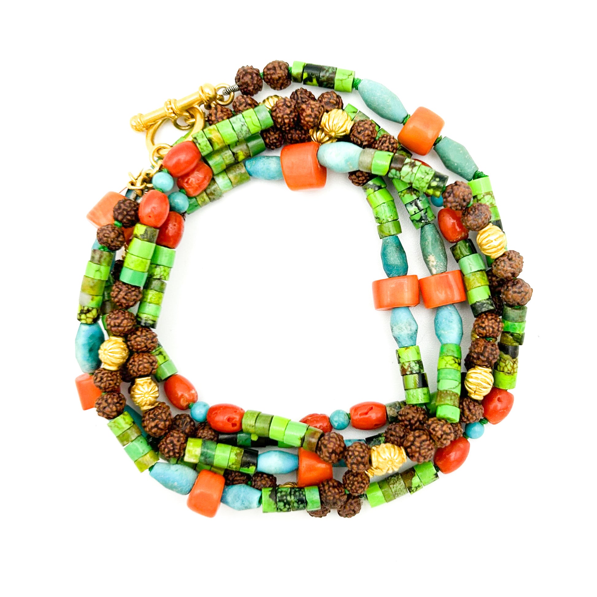 "Woodstock" Necklace (Coral, Turquoise, Gaspeite, Rudraksha, 22k, 18k Gold)