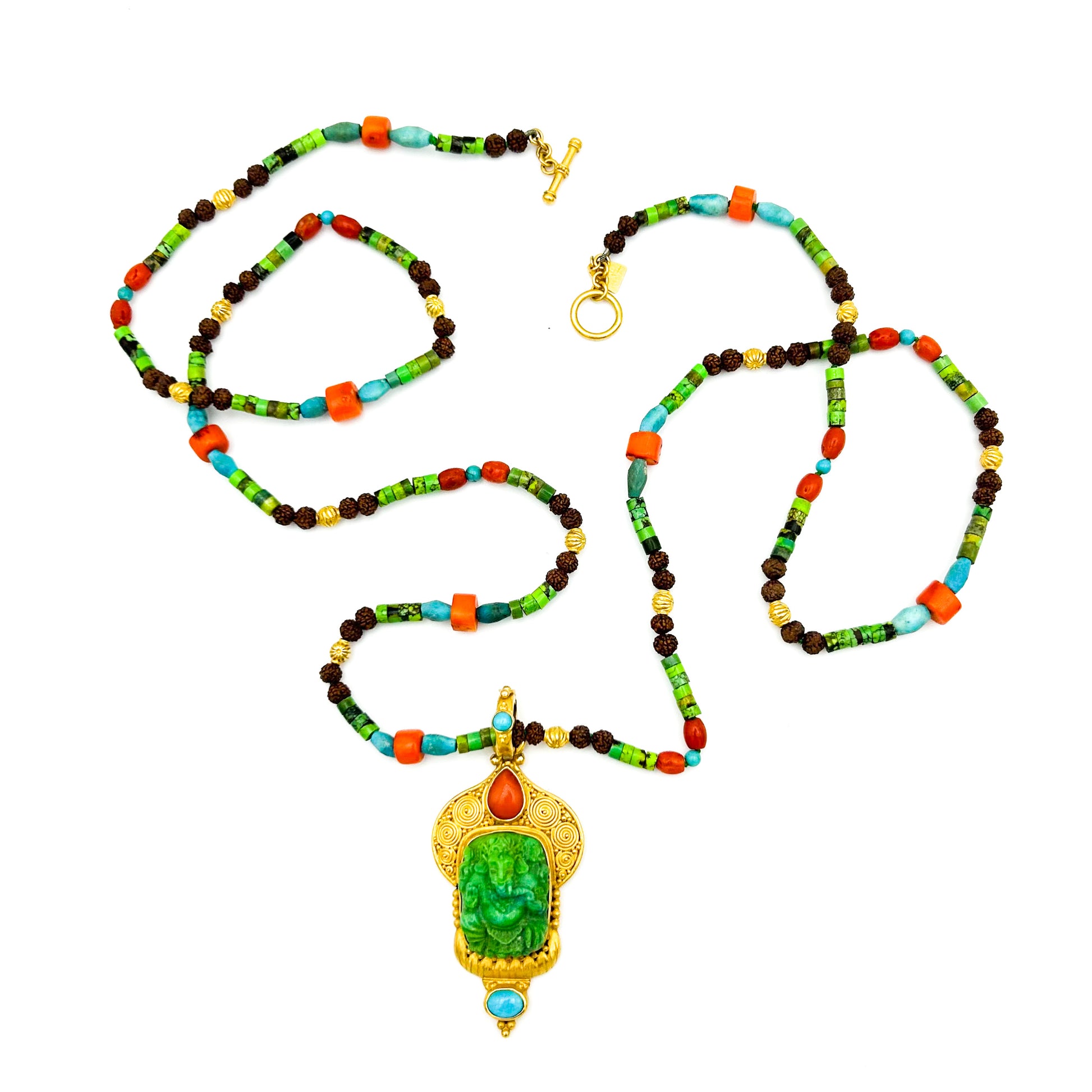 Life's a Festival, with our "Woodstock" necklace, a vibrant celebration of nature’s beauty. This opera-length necklace, measuring 36 inches, features a harmonious blend of gemstones and organic elements, including sacred Rudraksha seeds, coral, turquoise, and gaspeite, interspersed with 22k gold bead accents. The necklace is finished with an 18K toggle clasp, adding a touch of luxury and ensuring a secure fit. Perfect for layering or wearing as a standalone statement, this piece pairs well with our coral or turquoise pendants, (shown with "Temple of Ganesh" P-12456) and converts to a belly-chain, double-strand, or wrapped 5 x as a bracelet. The ultimate travel companion to express your bohemian spirit!
