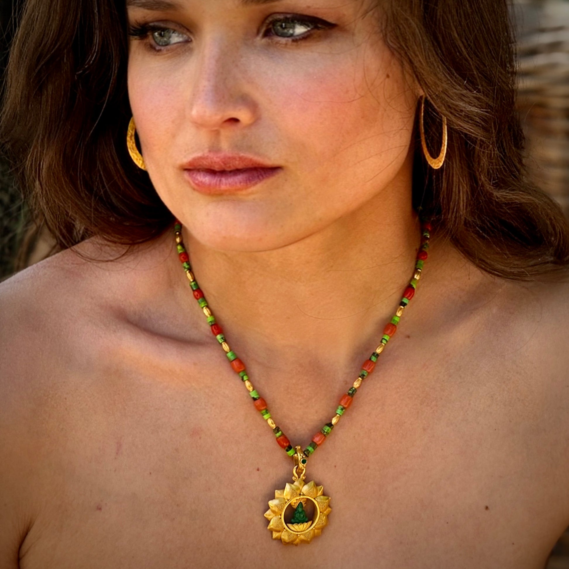 This Boho-beachy 22k gold necklace with Italian coral, turquoise, and gaspeite beads is perfect for every day casual with a very wearable 22" length (unisex!), and it can double as a 3 x wrap-bracelet. Add one of our gemstone charms or spiritual talismans (coral, or green or blue turquoise--shown below with our "Lotus Buddha" pendant) to match, and you'll never want to take it off! 18k clasp secures your treasure in style.
