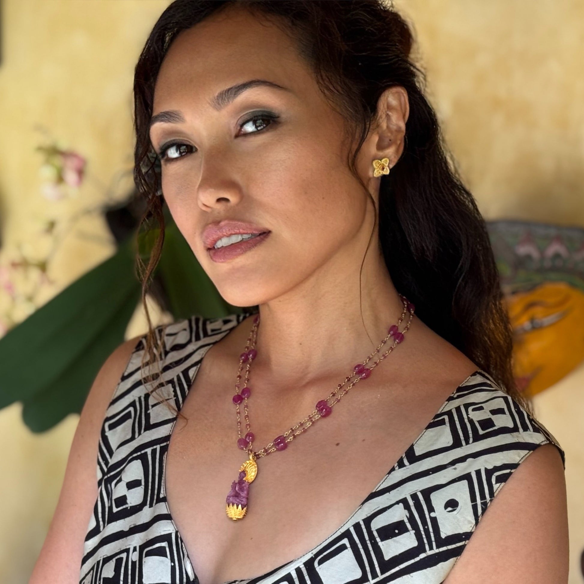 More than 109 carats of crimson-red ruby beads adorn this versatile 36" long hand-linked 18k gold "Staccato" chain necklace, which also can be worn as a bracelet, belly-chain, or doubled as a shorter necklace. This gorgeous Art Deco-inspired design is a great travel piece, since the 18k hook clasp allows transformation into so many other options, and it can be dressed up, or worn more casually. Pair with our "Tradisi" gold tassel pendant (shown with ruby pendant, on model), or any of our other complementary pendants!