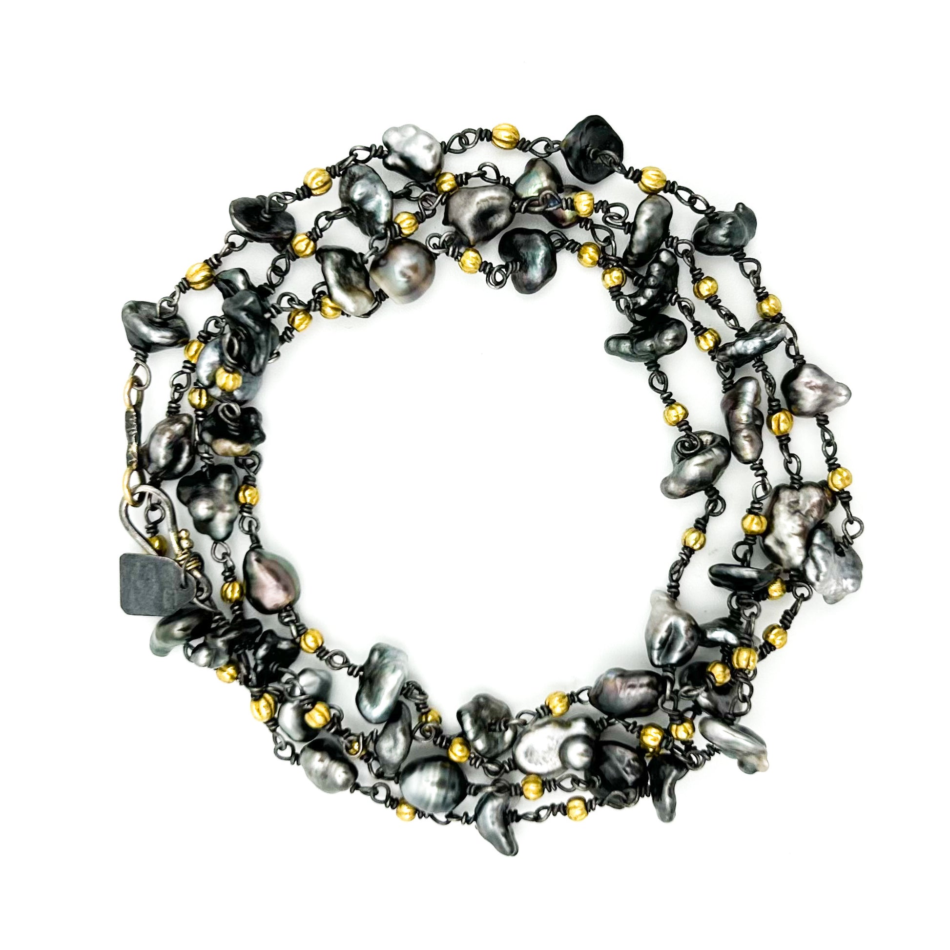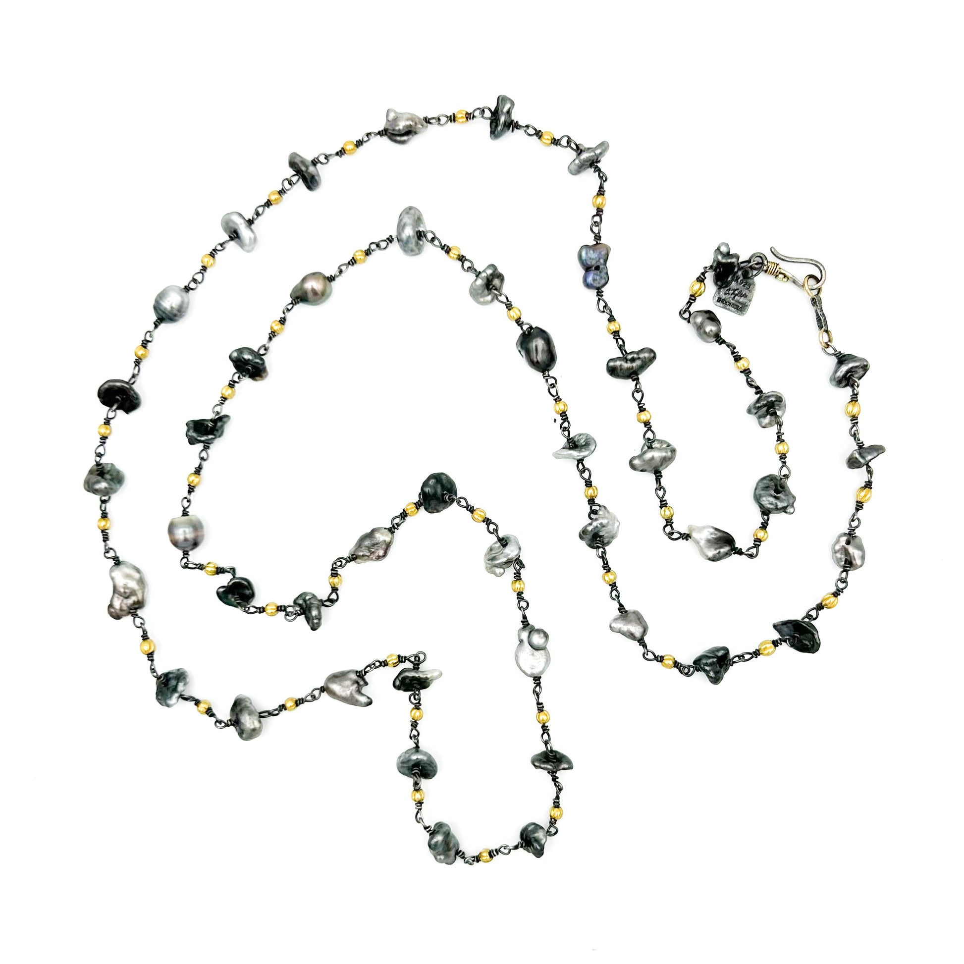 The most precious pearls are not cultivated-- they are naturally formed by bits of sand or other foreign objects entering a South Pacific oyster (Pinctadus Maximus), and being coated in its iridescent nacre over months or years--this lustrous organic substance magically creates pearls. These natural, freeform pearls are known as "keshi", and are most highly prized, because they are 100% nacre, and non-cultured. In our "Winona" necklace, 12.76 grams of lustrous and rare gunmetal-toned Tahitian Keshi pearls were hand-drilled and strung on oxidized sterling silver wire links, interspersed with hand-made 22k gold beads, for pops of matte gold contrast. This versatile 36" opera-length necklace does double-duty as a 2-strand choker, and 5-strand wrap bracelet, and pairs well with our pearl pendants and mixed-metal charms (shown on model with P-13525 black pearl "Christine" pendant). An elegantly casual wearable jewel made from Nature's oceanic treasures--natural Tahitian keshi pearls!
