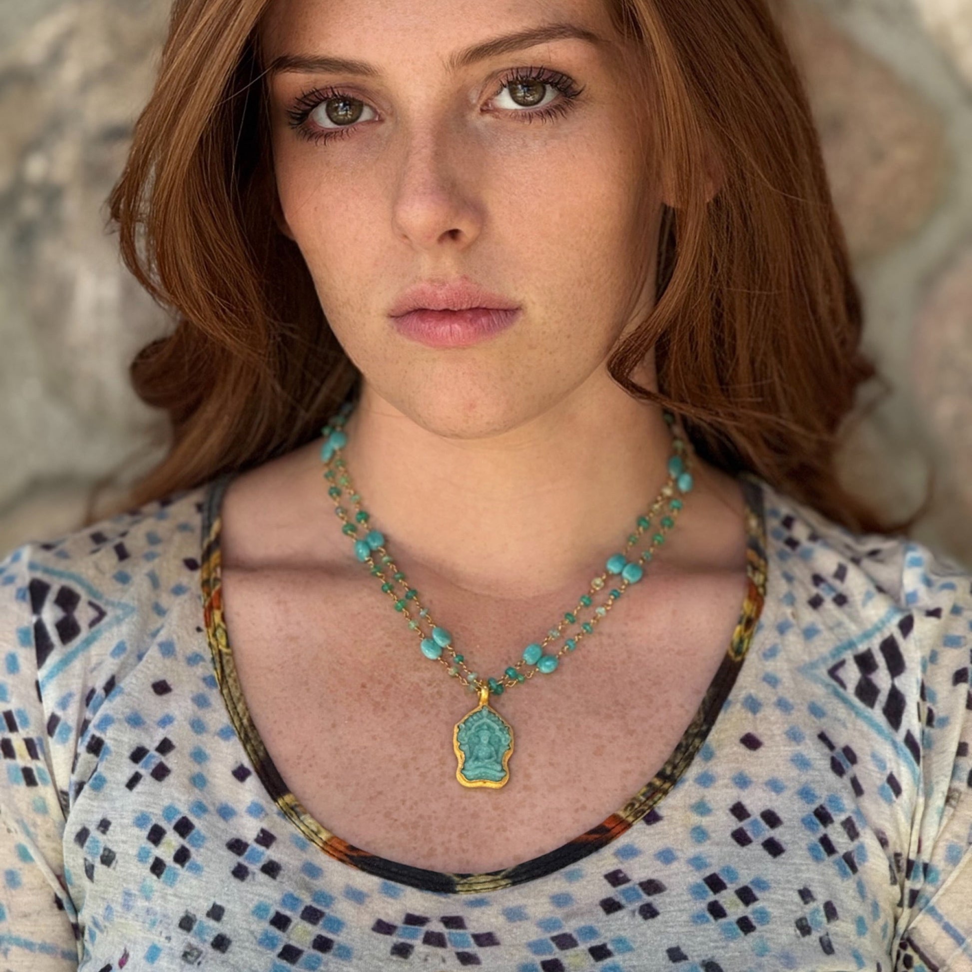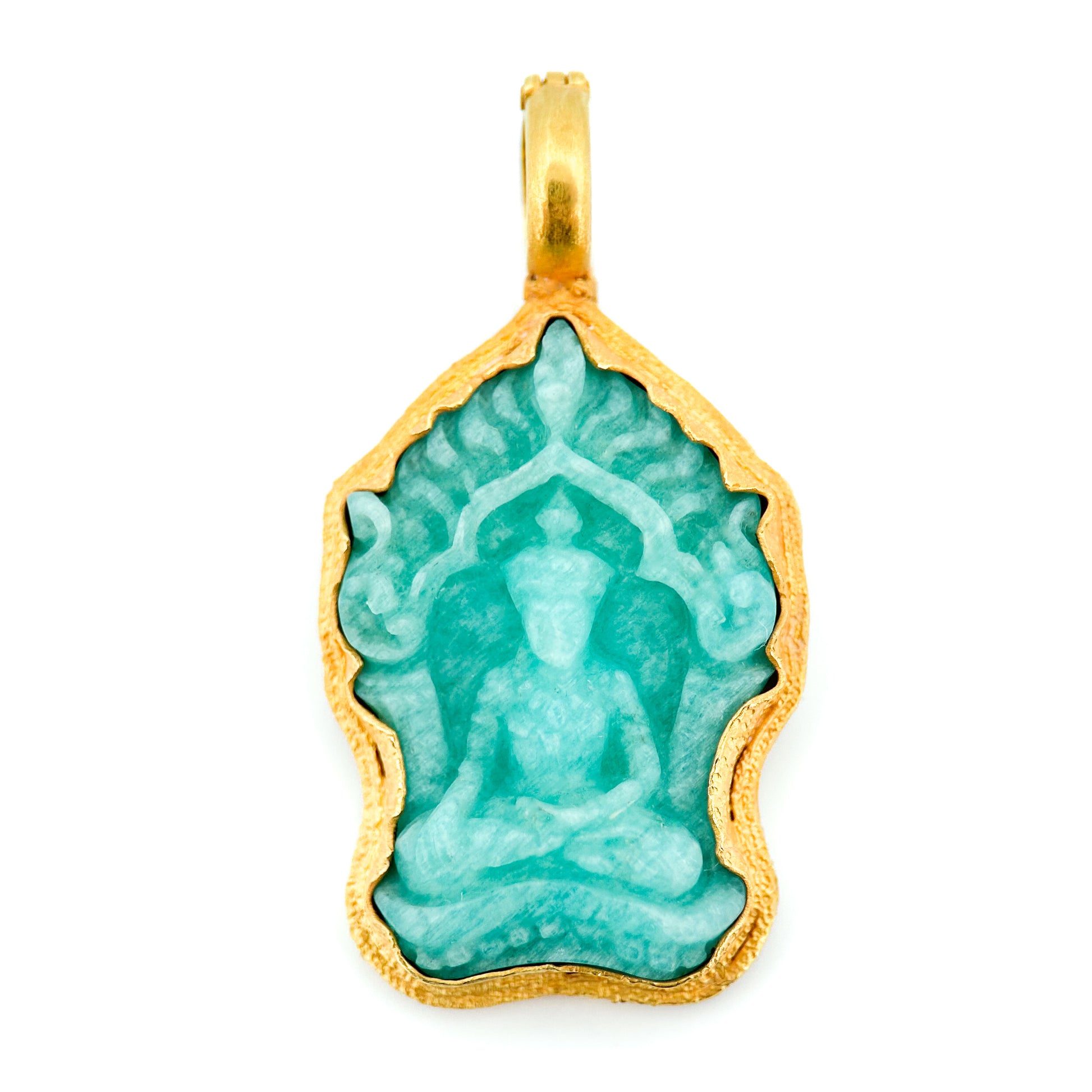 This exquisite tropical-water blue 13 carat translucent Amazonite hand-carved amulet is the perfect companion to wear close to your heart. A finely-detailed Buddha figure is seated in contemplation in a small shrine-like carved decorative frame. Encircled in 22k yellow gold, it secures to your own cord or gold chain (or our matching "Winona" necklace, shown on model), with an hinged 18k clasp for strength and durability.