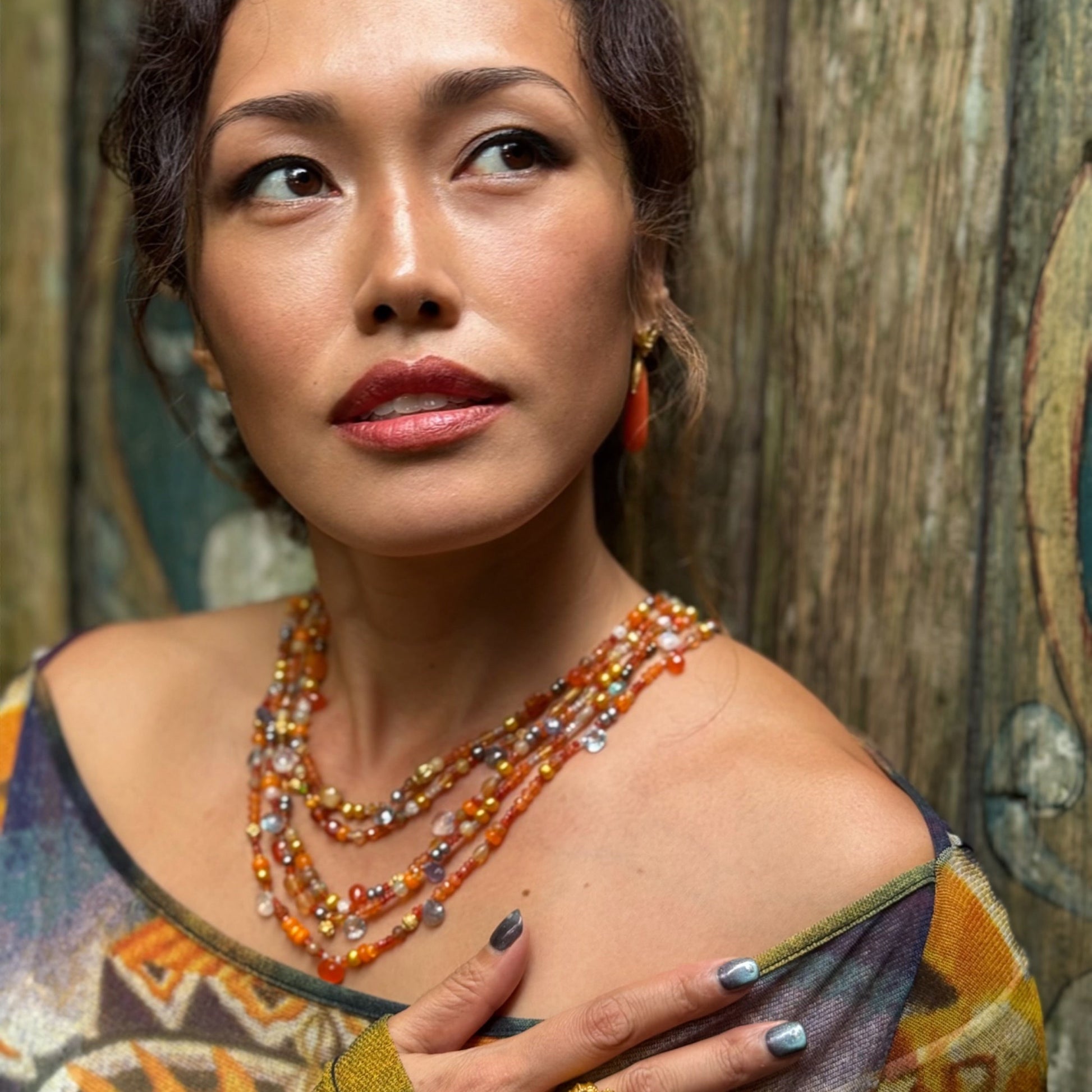 Introducing the "Lana Charm" five-strand beaded necklace--an alluring festival of cool gemstone colors and shapes. Exotic gems from nearly every continent: Neon apatite, multicolor sapphire, turquoise, tanzanite, emerald, tourmaline, freshwater pearl, coral, labradorite, topaz, amethyst, opal, all hand-shaped and artfully strung with 22k gold beads in whimsical shapes. The nesting strands of beads are secured with an 18k hook clasp for strength and durability. Also comes in predominantly pink/red/purple tones, and "Autumn" warm tones (shown on model in photo). 17" (shortest strand).