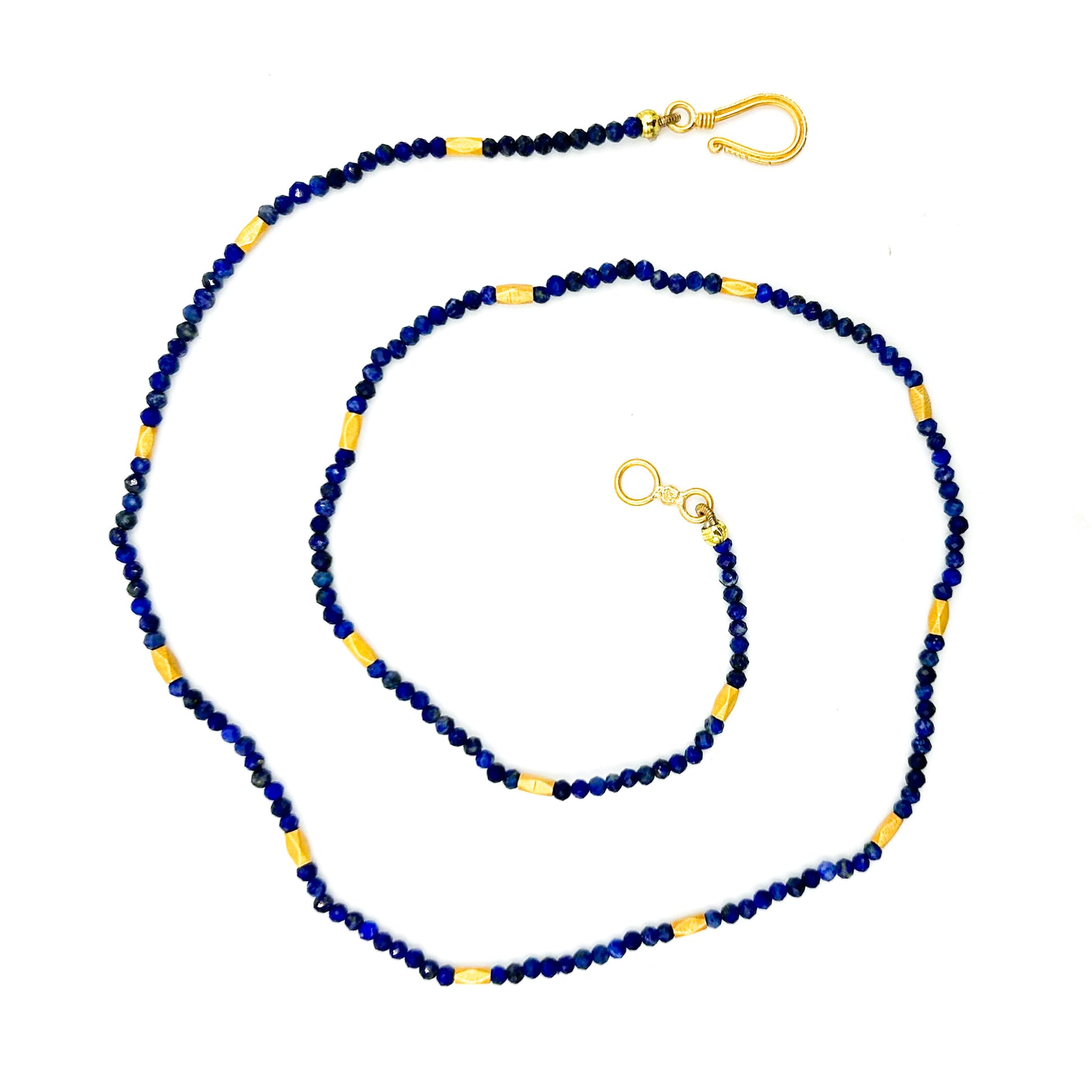This "Whisper" of a necklace is perfect for pairing with many of our small charm pendants, or layering with your other favorite delicate chains. Hand-made from 22k gold tube beads strung with tiny hand-made deep blue faceted lapis lazuli beads (18" long). The 18k clasp assures secure fastening. Check out our Lapis Lazuli "Romanus" inlaid Venetian glass intaglio pendant (P-13615, shown) or our matching "Candi Ganesha", and "Sri Lanka Teardrop" charms, made especially for this necklace!