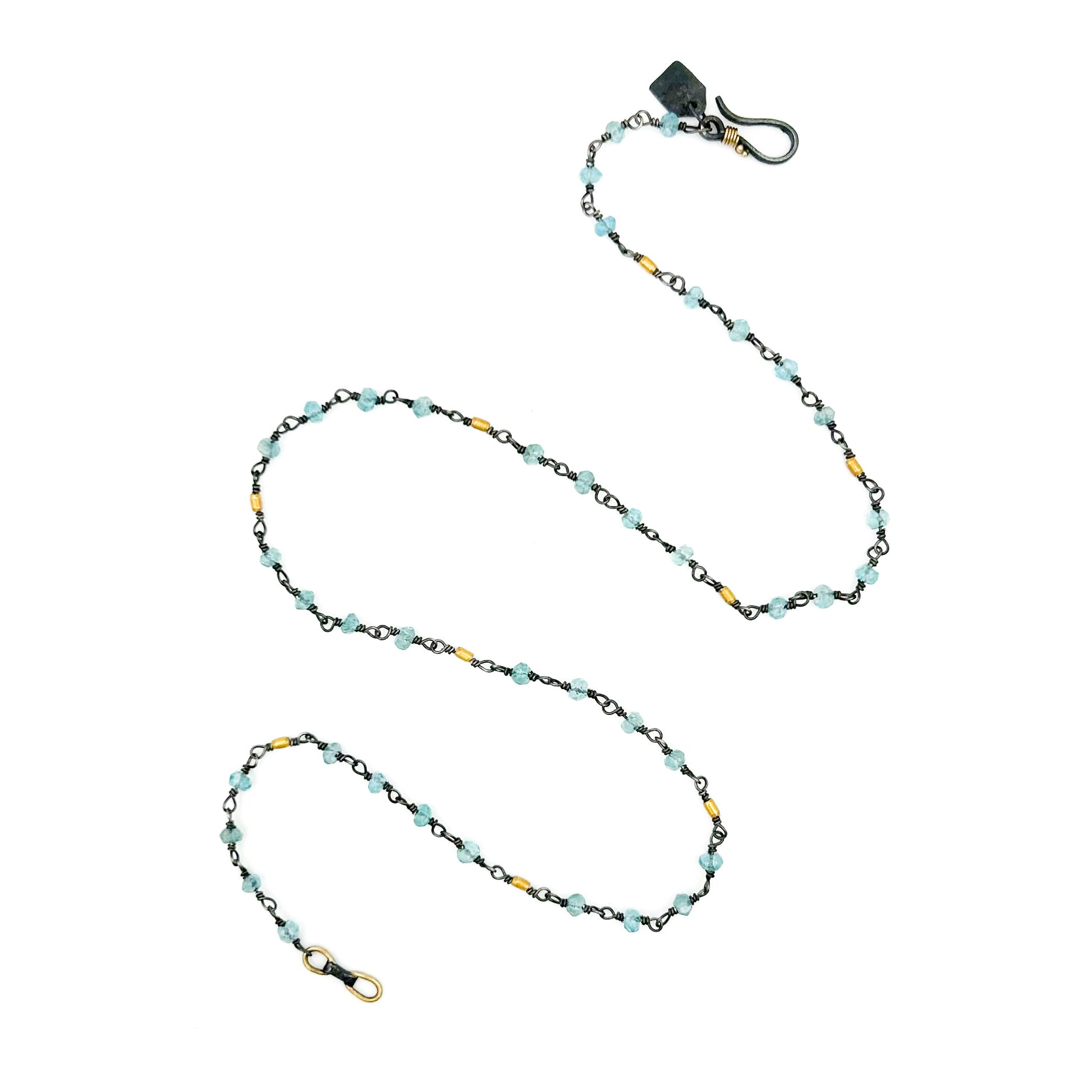 One of our most delicate and feminine necklaces, our "Winona" handmade chain's oxidized sterling silver links create a rustic, bohemian flair. With 5 carats of round faceted aqua-blue apatite beads contrasting with the gunmetal gray and buttery yellow of 22k beads, this necklace is ideal for layering, or wearing solo with one of our matching pendant charms. 17" long.