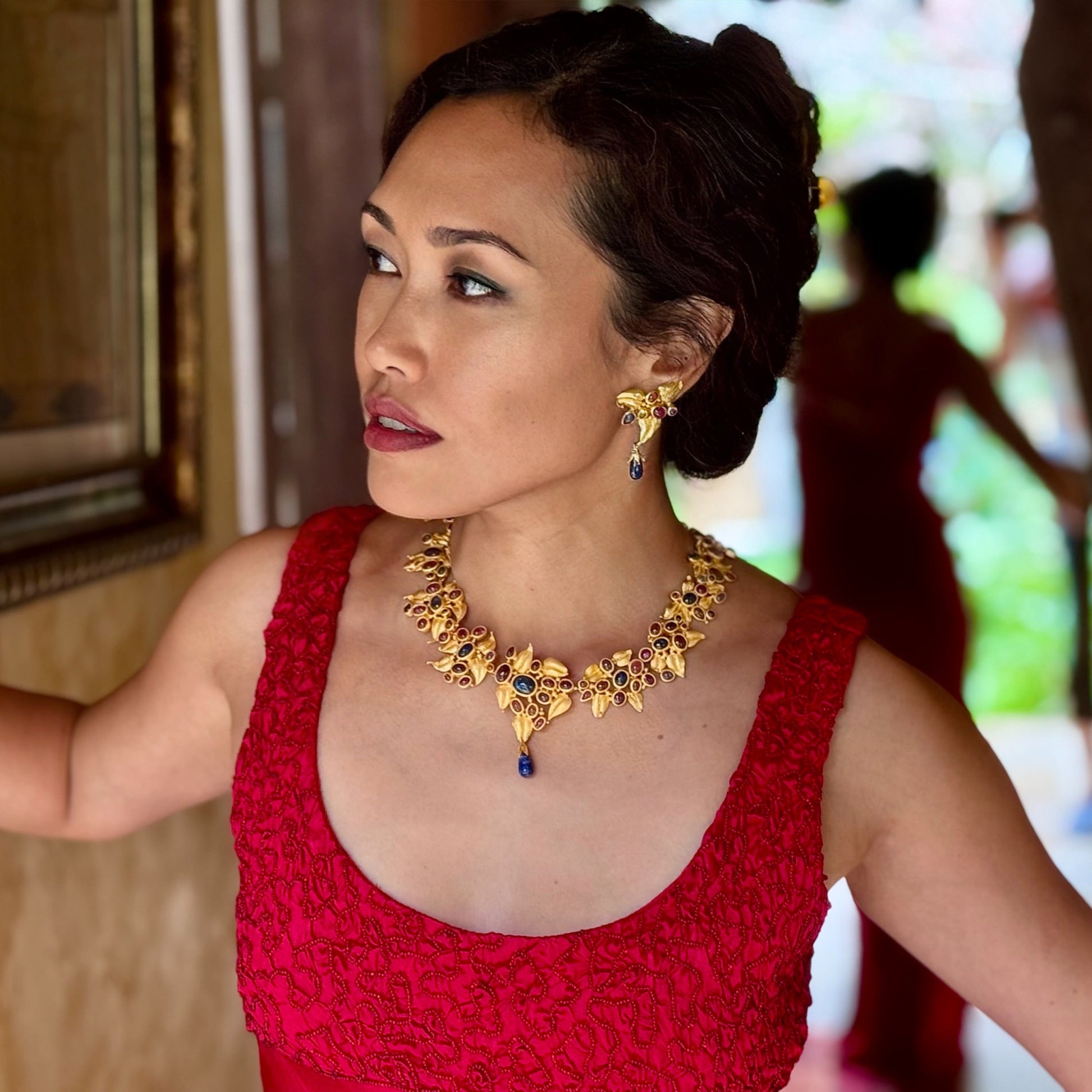 From our exclusive Magnum Opus Collection, this one-of-a-kind "Ophelia" necklace, is a masterpiece of timeless artistry, forged by a father-son Balinese master goldsmith team, taking 120 days to complete. Crafted in matte-finish 22K gold, this 16-inch collar-style necklace features dozens of individually-made golden leaves, using the ancient technique of repoussé with granulation detail. Colorful Umba Valley African sapphire and ruby cabochons (135 carats), their vibrant hues of deep blues, rich reds, golds, and subtle purples enhance a floral-inspired design that exudes opulence. Pushing down on one of the sapphires releases the hidden locking 18K clasp, cleverly concealed at the back. A detachable blue sapphire drop adds versatility, allowing you to customize the look for any occasion. Pairs with the matching "Ophelia" earrings (sold separately); this necklace is ideal for those who seek to own a truly unique piece of wearable art from our most prestigious collection. We can custom make a ring and bracelet to match upon request, to round-out the set.