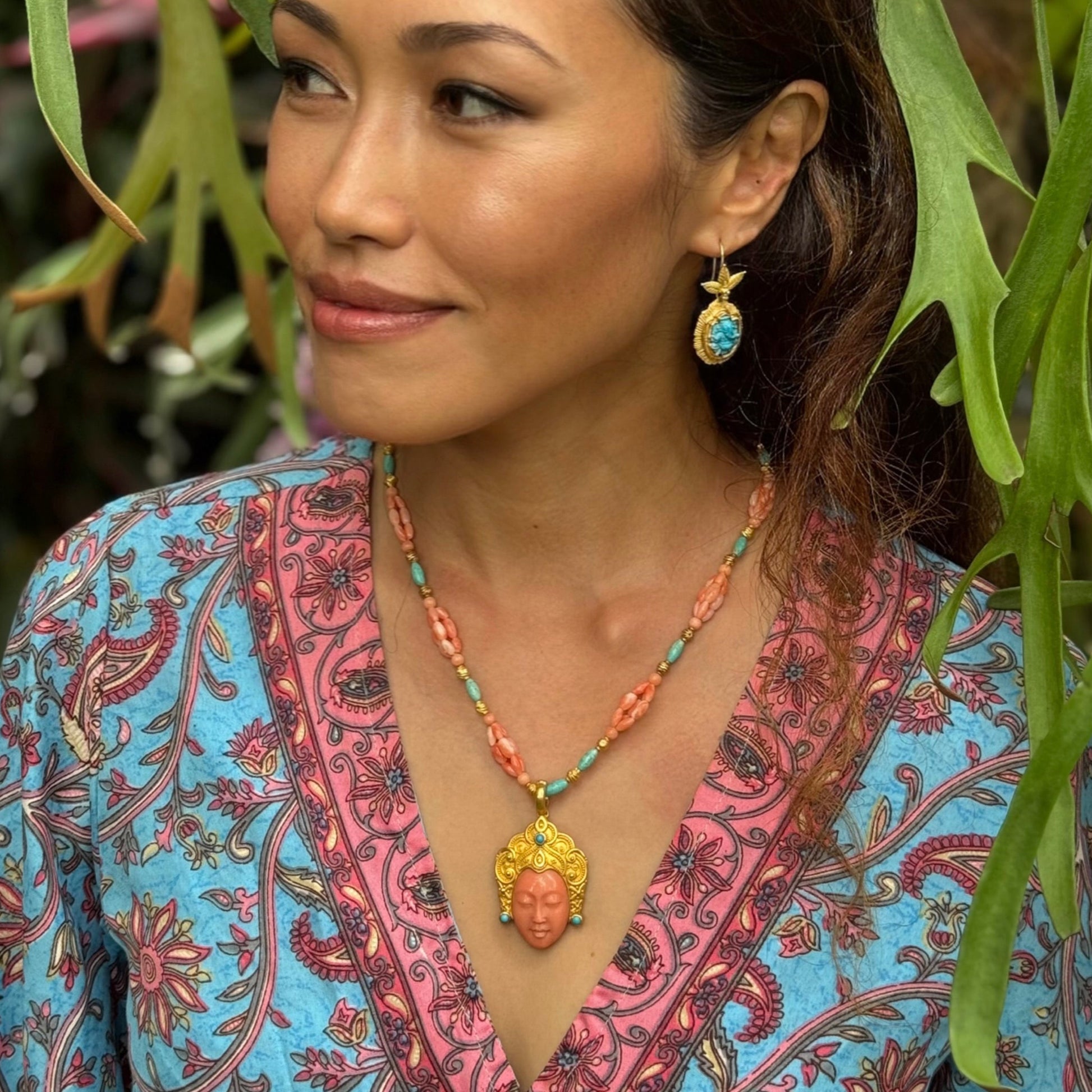 "Bali Goddess" Pendant (Mediterranean Coral, Sleeping Beauty Turquoise, 22k Gold)