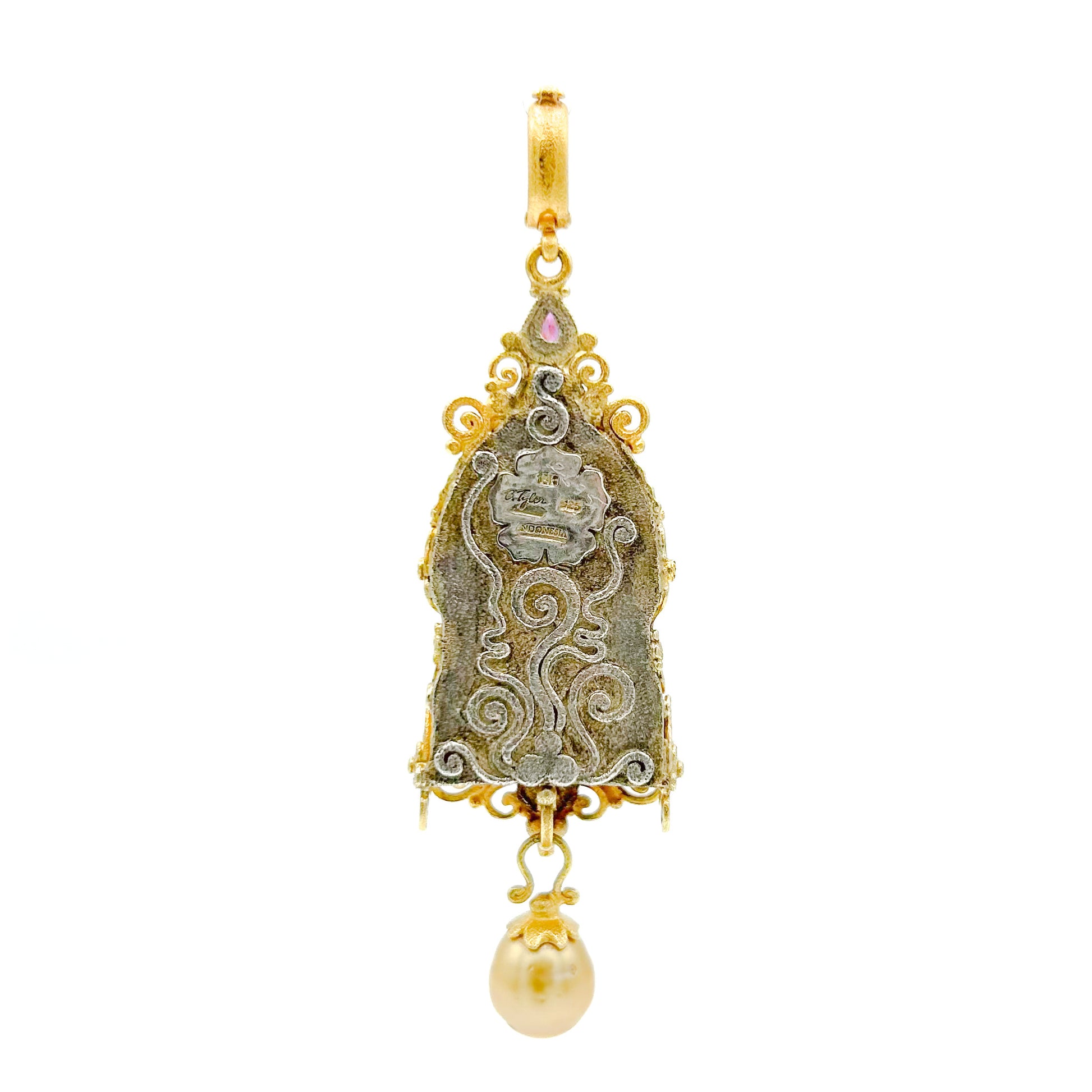 A fine quality 59 carat rock crystal quartz was hand-carved by Balinese craftsmen to reflect the design of Goa Gaja, an ancient and powerful holy shrine in Ubud, Bali. The 11 Century Hindu-Buddhist cave was robbed of it's Buddha statue guardian long ago, but the designer created a miniature "replacement" with a 1.9 carat rubellite tourmaline Buddha, hand-shaped in meticulous detail, seated in its golden niche. The upper finial is adorned with a .45 carat ruby pear-shaped "flame" and the lower frame holds a .40 carat emerald and detachable golden South Sea pearl drop. On the reverse side, a stippled sterling silver plaque is decorated with swirls reminiscent of Sanskrit writing. Pairs beautifully with our matching "Kerala" mala-style tasseled necklace (shown on model), or a long gold chain. Experience the talismanic energy of our "Candi Shrine" designs, available in a variety of colored gemstones, all hand-carved by masters, and blessed with holy water from a sacred Balinese spring. Approximately 1" x 3". One of a kind, but we have versions with other carved gemstones.