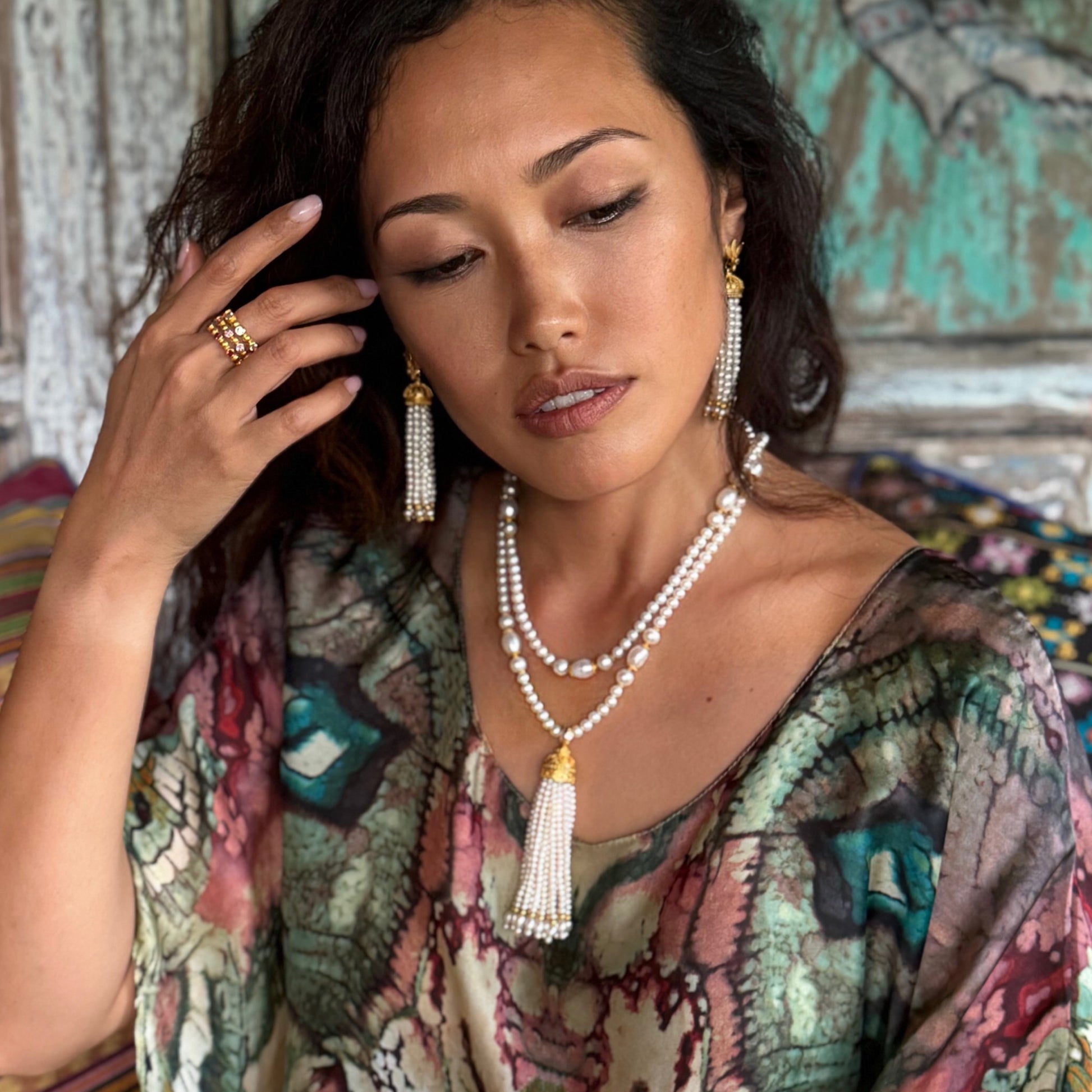 Dozens of strands of tiny freshwater pearl beads make up our luxurious "Westminster" tassel pendant. Capped with an ornately decorated 22k yellow gold finial, the tassel dances on its chain, whether you wear it short or long--you will not be able to stop toying with the silky feel of this kinetic pendant. Generously proportioned at 4” long x .75” wide, the hinged 18k gold clasp opens to accept a pearl strand (shown on model, with matching earrings) or a gold chain. It also looks fab on a larger strand of knotted pearls (the clasp fits between the pearls)--a nice update for that strand you inherited!