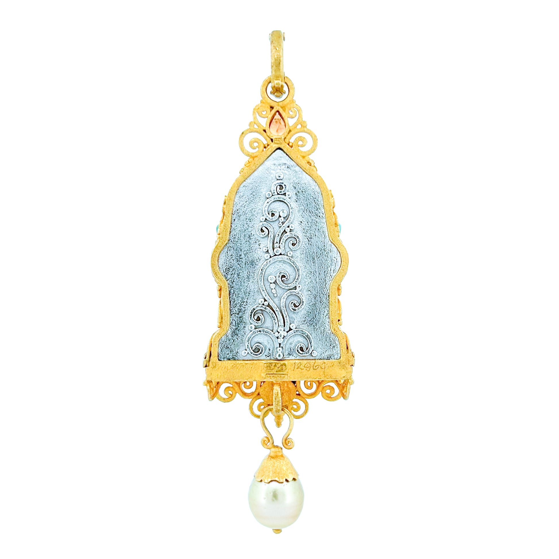 A very fine quality 90.5 carat Australian chrysoprase stone was hand-carved by Balinese craftsmen to reflect the design of Goa Gaja, an ancient and powerful holy shrine in Ubud, Bali. The 11 Century Hindu-Buddhist cave was robbed of it's Buddha statue guardian long ago, but the designer created a miniature "replacement" with a 2.3 carat carnelian agate, hand-shaped in meticulous detail, seated in its golden niche. The upper finial is adorned with a .70 carat orange sapphire "flame" and the lower frame holds a .55 carat emerald and detachable golden South Sea pearl drop. On the reverse side, a stippled sterling silver plaque is decorated with swirls reminiscent of Sanskrit writing. Pairs beautifully with our matching "Kerala" mala-style tasseled necklace (shown), or a long gold chain. Experience the talismanic energy of our "Candi Shrine" designs, available in a variety of colored gemstones, all hand-carved by masters, and blessed with holy water from a sacred spring.