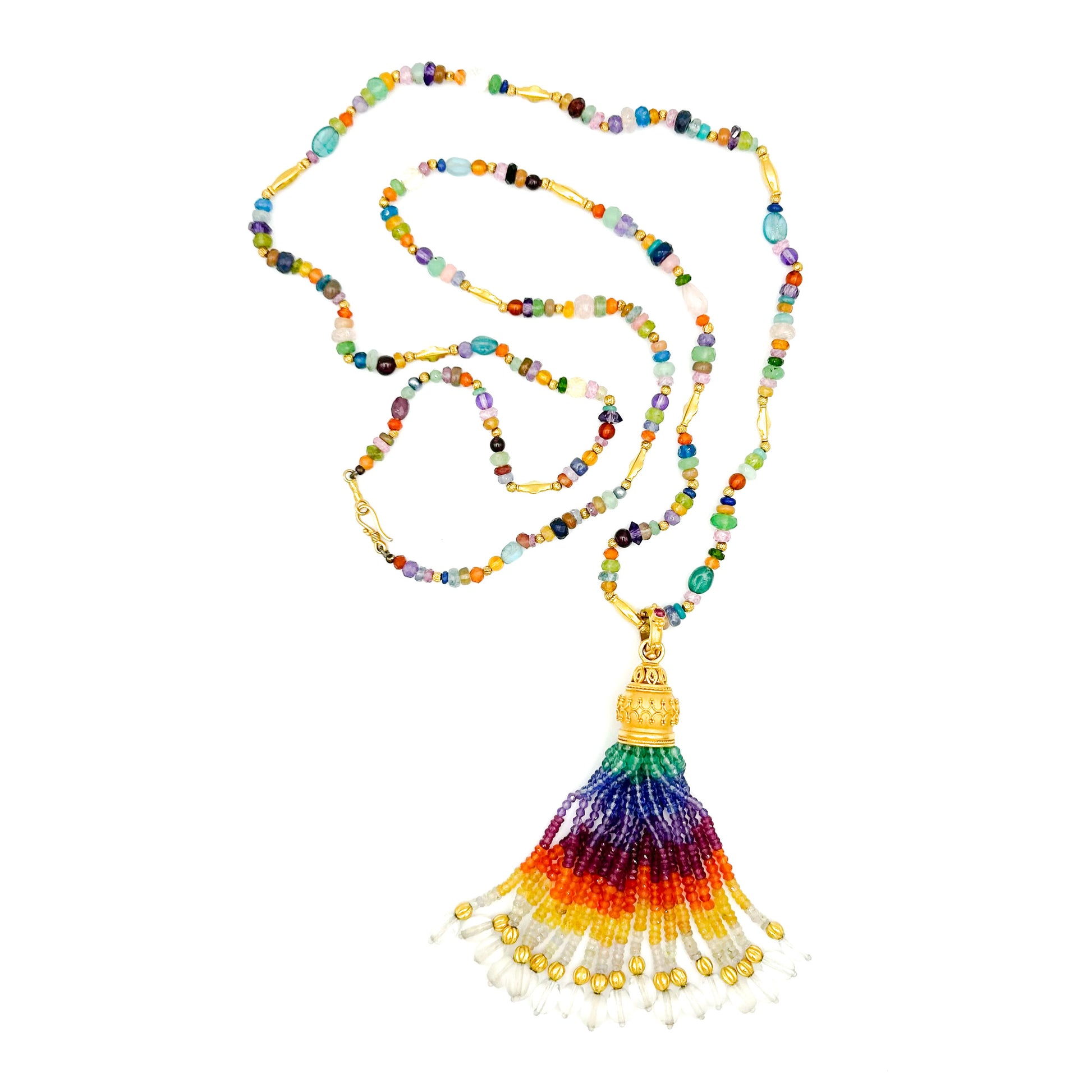 Unleash your Bohemian style with the "Tradisi Rainbow" tassel pendant, a dazzling cascade of faceted gemstone beads: rich blue and yellow sapphire, shimmering tanzanite, violet amethyst, fiery ruby, vibrant apatite, warm carnelian agate, finished off with clear quartz crystal in a rainbow prism of color. Each bead dances in this luscious pendant, crowned by a 22k matte yellow gold cap adorned with intricate granulation and wirework detailing. The hinged 18k gold clasp, set with a delicate pink sapphire, opens to fit chains or beaded necklaces up to 5mm. An eclectic one-of-a-kind treasure to pair with one of our beaded necklaces or long gold chains —add this stunner to your collection today!
