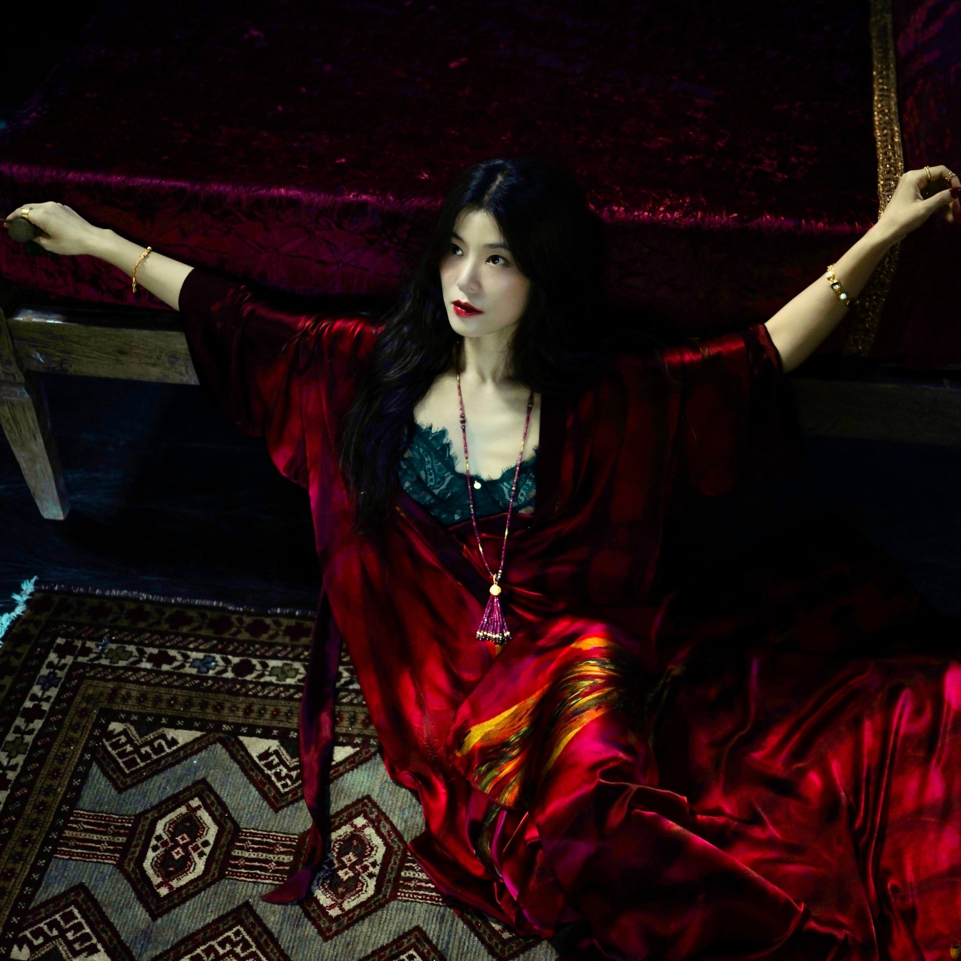 Indulge in Bohemian style with the "Urchin" tassel pendant, a dazzling cascade of 41 carats of small vivid crimson ruby beads, crowned by a 22k matte yellow gold cap adorned with intricate granulation detailing, resembling a sea urchin. The hinged 18k gold clasp opens to fit chains or beaded necklaces up to 4mm diameter. 4” long x .75” wide. An eclectic one-of-a-kind treasure to pair with our beaded ruby "Lola" necklace (N-13428, shown on model) or a long gold chain.