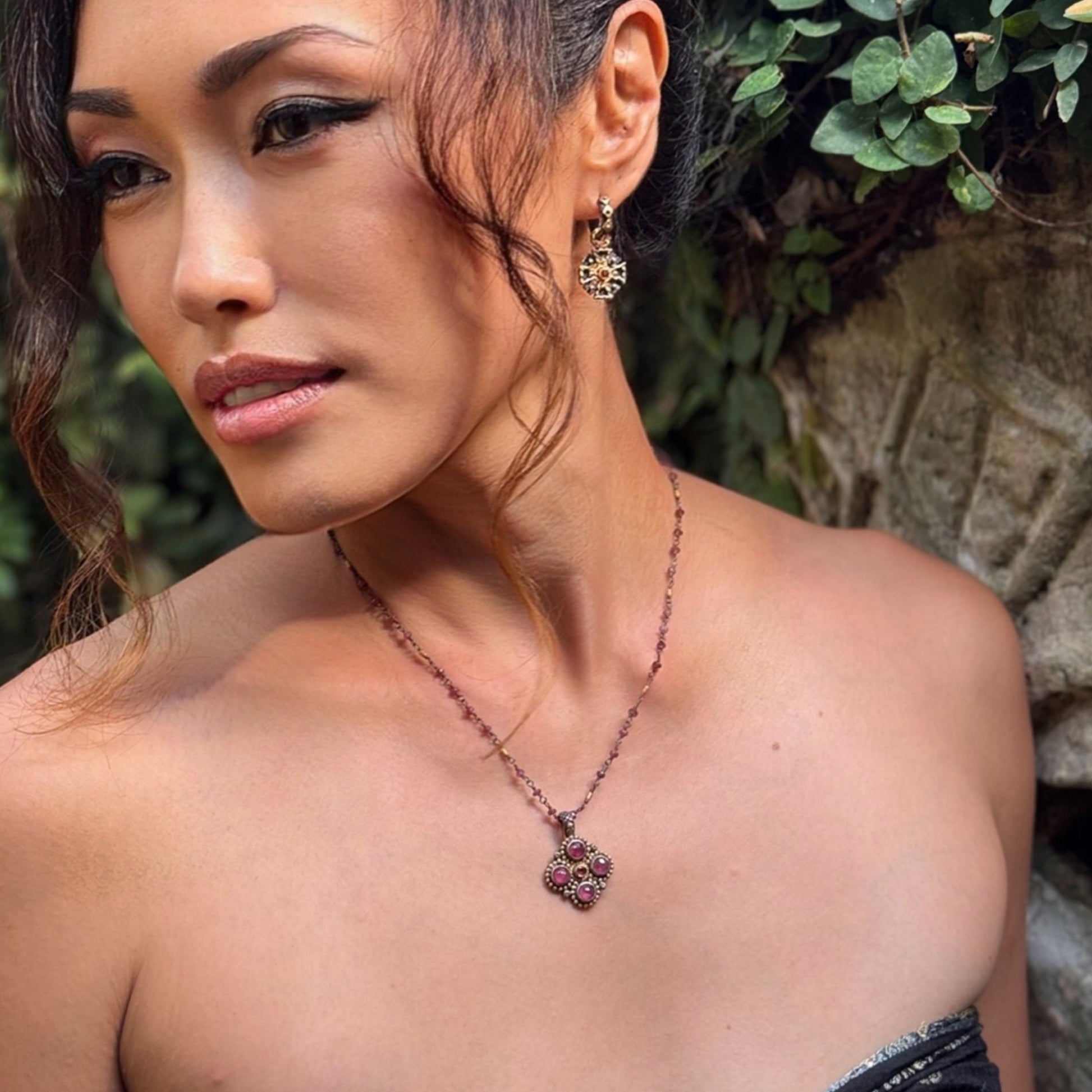 Our "Mini Maltese" cruciform pendant, hand-fabricated in a casual blend of oxidized (blackened) sterling silver contrasting with 18k gold is the perfect petite charm for delicate beaded necklaces and mixed-metal chains (our "Chennai" chain with sapphire and kyanite, shown). Graced with 2.25 carats of rose cut blue sapphires, this versatile piece has a Bohemian vibe, great for everyday wear. A hinged clasp fits over chains and cords up to 4mm in diameter, overall size: 1" x 1.25". Also available in moonstone, ruby (shown on model), and apatite.