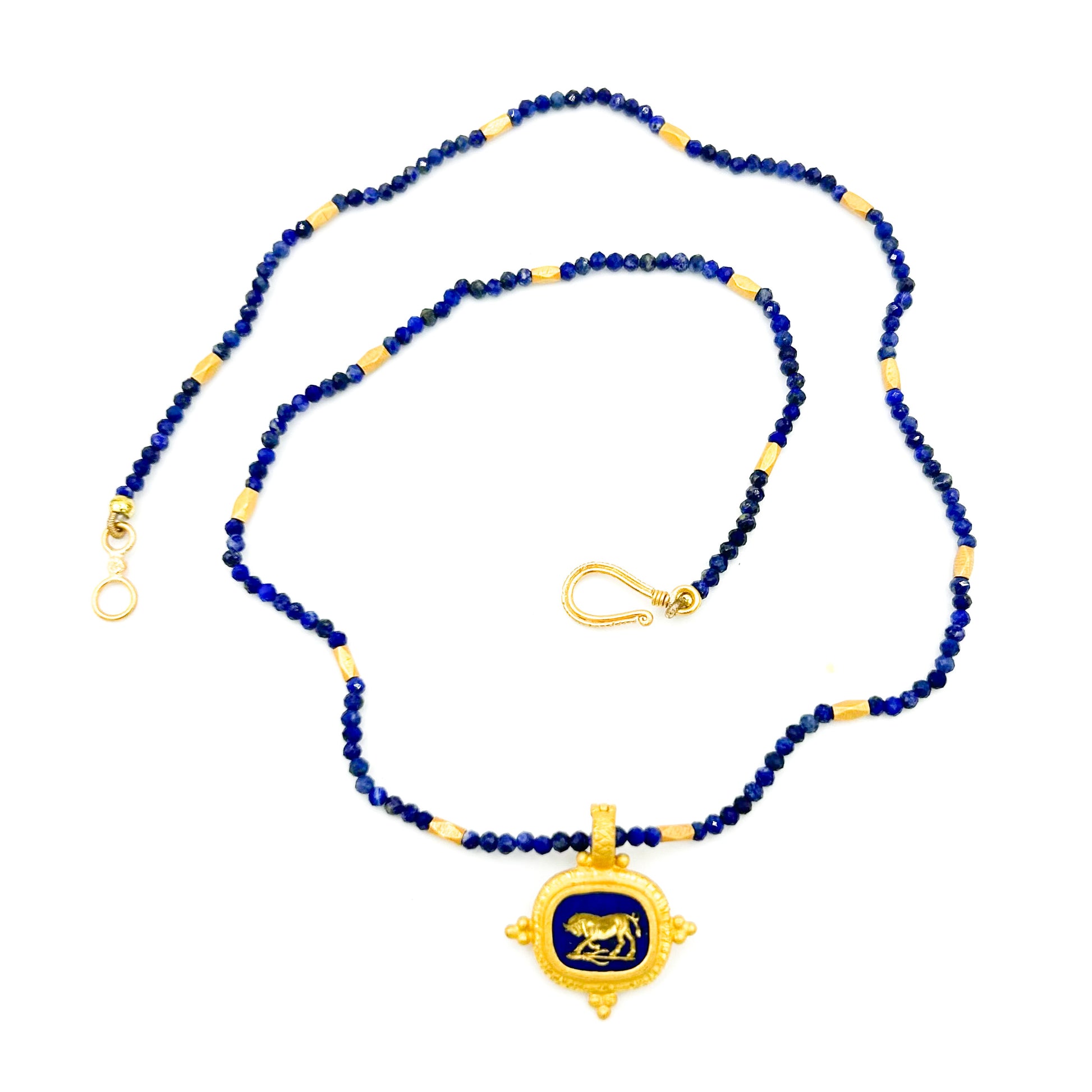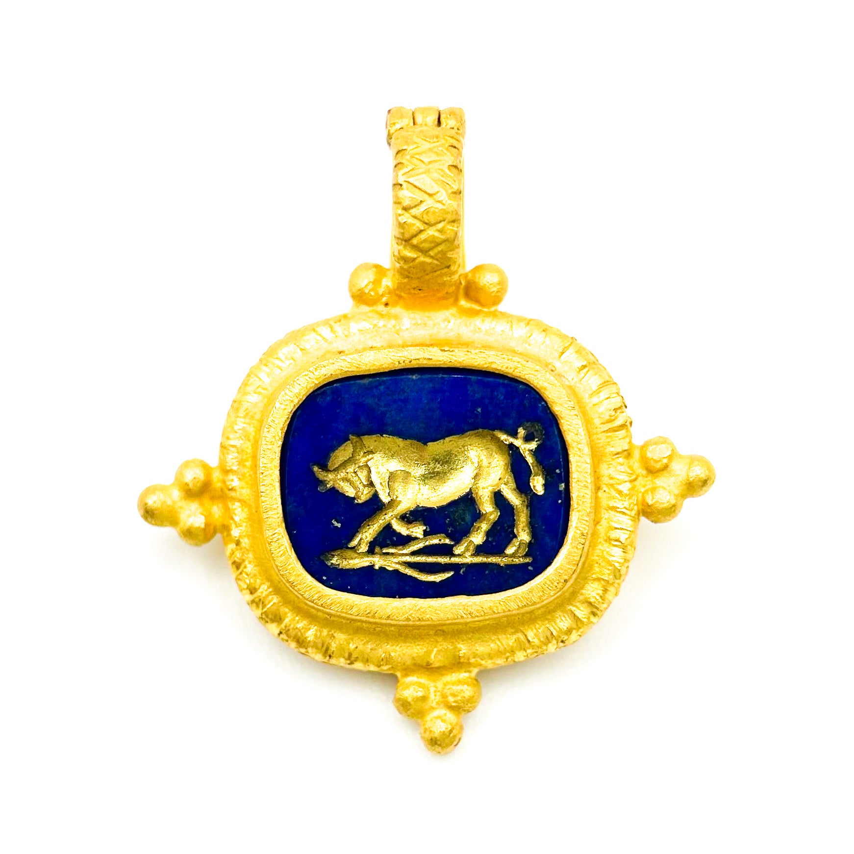 One of our smaller pendants, this "Romanus" charm features a 2.1 carat lapis lazuli stone, carved and etched with a charging bull figure, inlaid with gold foil. An 18k gold hinged locking clasp secures your treasure on your favorite necklace. Or, pair with our "Whisper" lapis lazuli necklace (shown) or one of our "Wheat" or "Pattya" delicate chains. A sterling silver plaque on the reverse side bears the maker's mark and provenance, 1” long x .75” wide. The perfect jewel companion for Taurus collectors and ancient history lovers!