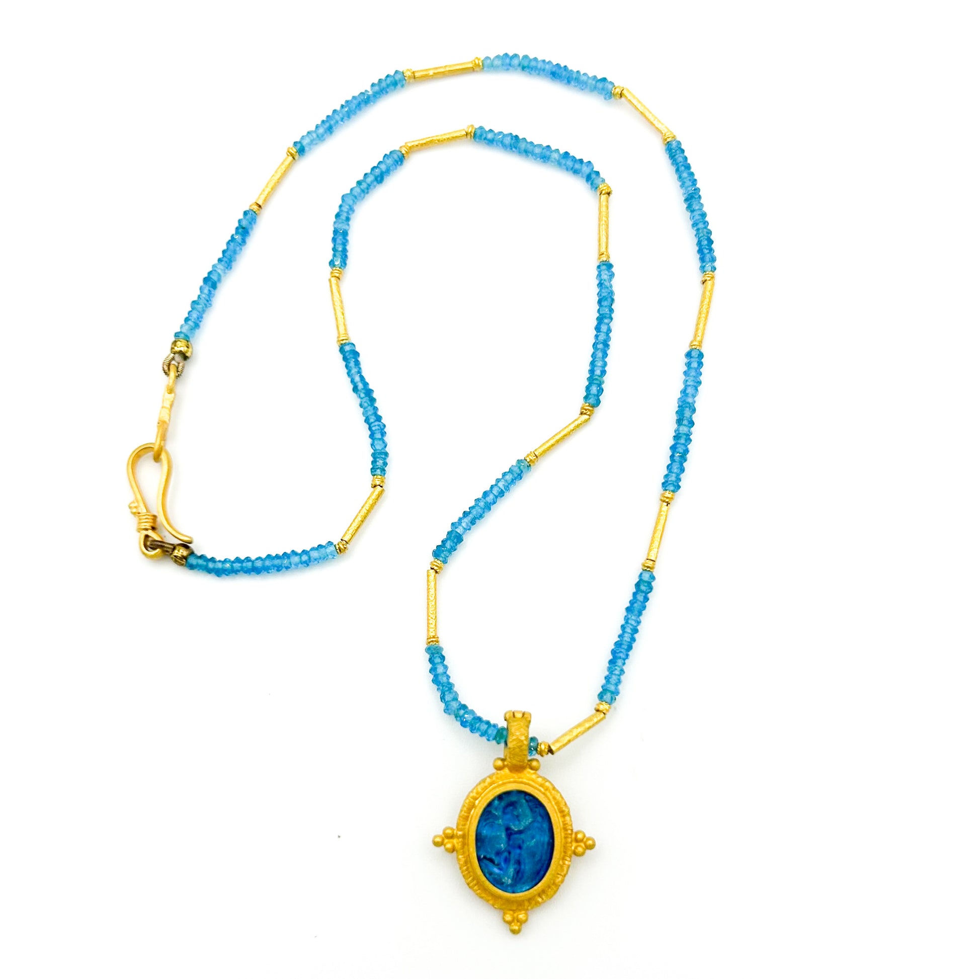 Like gazing into a blue lagoon, our "Romanus" Pendant, shimmers with a brilliant cerulean hue. 100% hand-crafted from 22k matte yellow gold, framing a small, but artfully embossed Venetian glass medallion with a winged Cupid/angel motif. A layer of precious rhodium backs the intaglio, reflecting the light and giving the piece a luminous glow, highlighting the figure's detail. Total carat weight: 3.1 cts; overall size: .5" x .75". The 18k locking hinged clasp fits over chains and beaded necklaces up to 3.5mm diameter. Pairs well with our finer chains, and beaded "Whisper" neck pieces (shown with N-13582 with neon apatite on model), and is great layered with other delicate necklaces! This piece is unique, but the style may be ordered with other colors of embossed Venetian glass intaglio or gemstone.