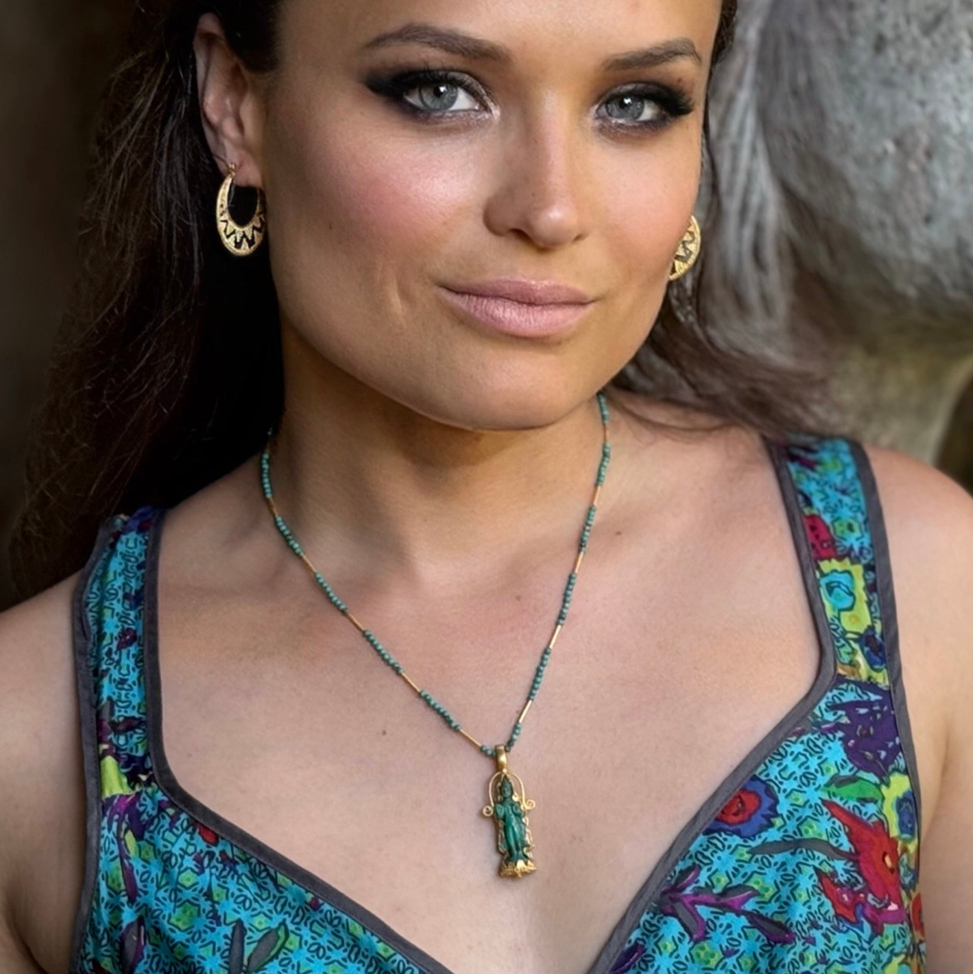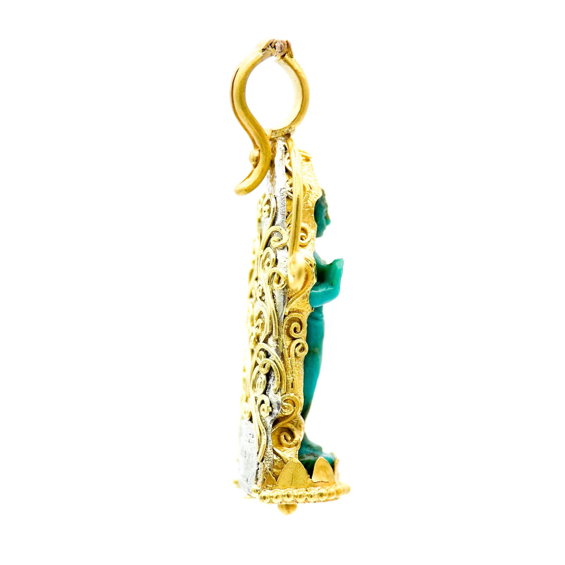 Our unique "Ayuthaya" 22k yellow gold pendant features a gorgeous hand-carved 9 carat blue-green turquoise standing Thai-style Buddha with scalloped gold detailing. On the reverse, scrollwork of sterling silver and gold creates a beguiling design. Petite yet impactful, at 1.25" x .5", this charm is a talisman of mindfulness and peace. 18k gold locking hinged clasp opens to accommodate a chain, cord, or beaded necklace up to 3.5mm in diameter. We recommend pairing with our "Whisper" necklace in matching turquoise beads (shown on model). This is a bespoke piece-- we cannot take special orders on this design, so only one collector can adopt this unique pendant.
