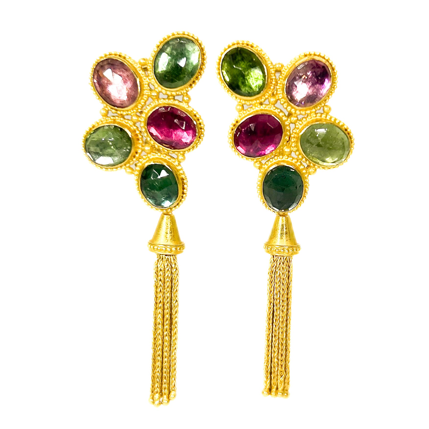 These elegant "Provence" button earrings showcase 15.14 carats of faceted rose-cut green and pink tourmalines, each beautifully encircled by intricate 22k gold granulation. The combination of the tourmalines' soft, captivating hues and the rich gold detailing creates a refined look that's both vibrant and sophisticated. A perfect balance of color and craftsmanship (includes comfortable Omega backs which convert to clip-ons with post removal). A hidden hook at the back makes addition of any of our earring drops possible--pair these with the Jezebel gold tassels for a swinging party vibe!