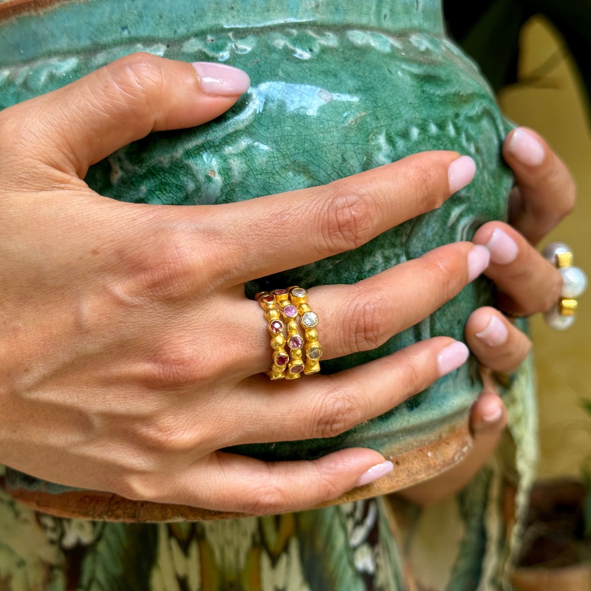 Our 18k matte yellow gold "Eternity" band ring with 1.84 carats of juicy orange sapphires makes a great stacking ring with the other colors (shown on model), to pair with your current favorites, or, try it together with any of our thin band designs. It's also the perfect "travel wedding ring" that makes your status known, but lets you leave your major bling safely in the home vault. This one's un-sizeable, at a 7.5, but can be custom-ordered.