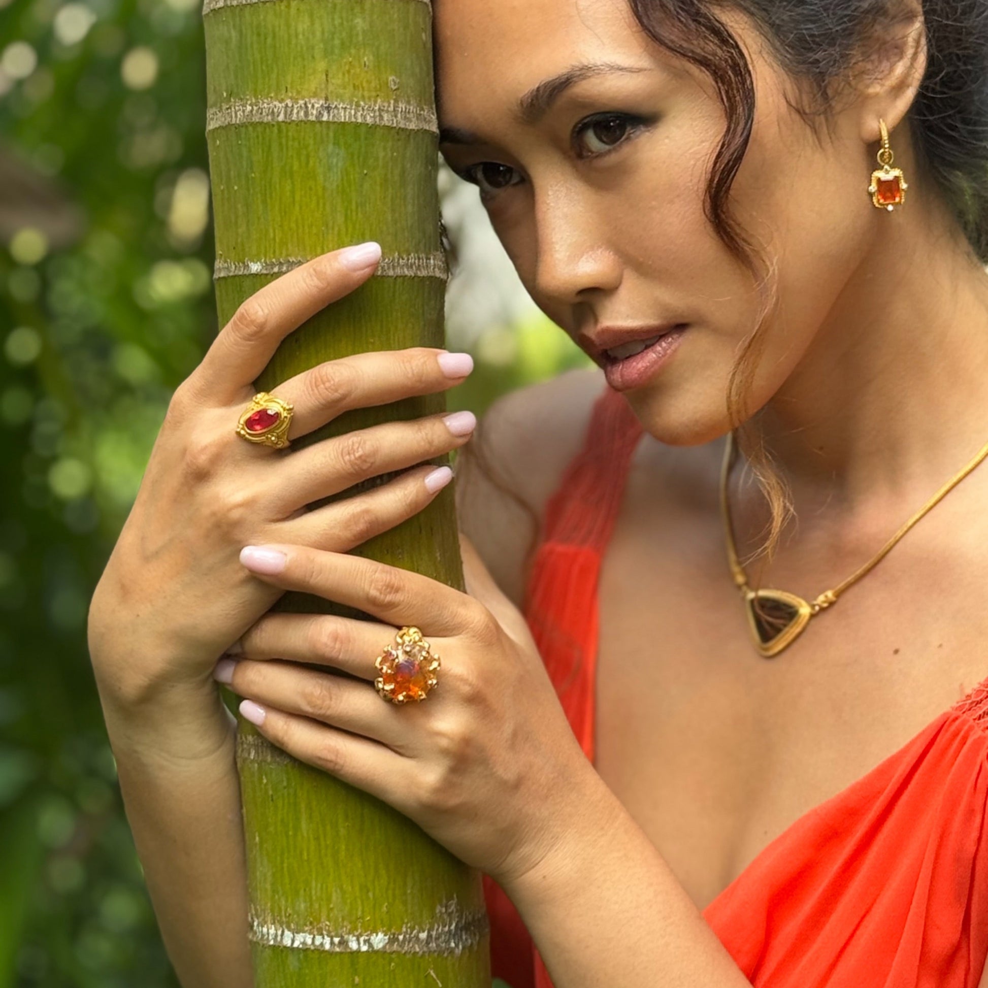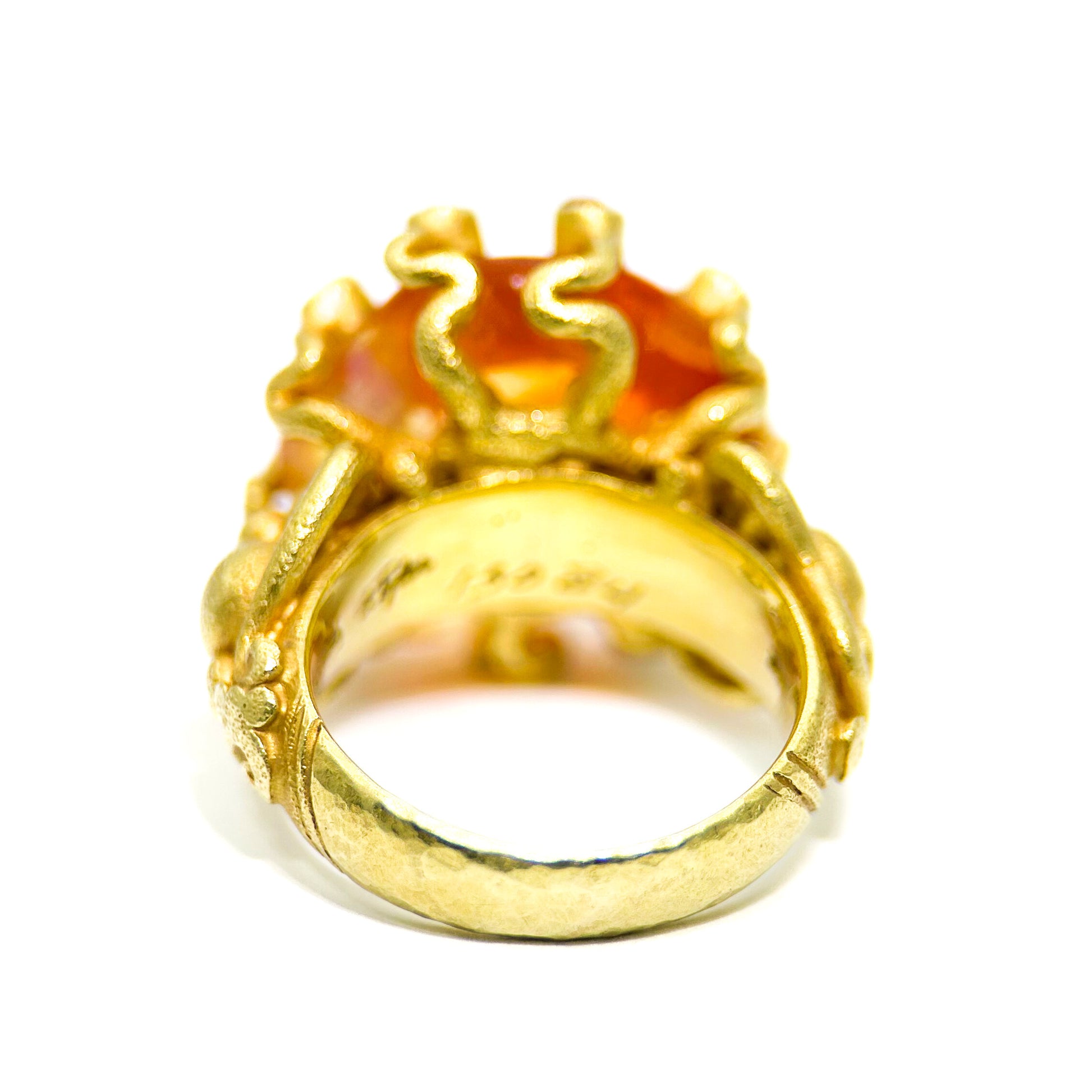 Presenting the "Fiery Octopus" ring, a breathtaking masterpiece from our exclusive Magnum Opus Collection of Important Jewels, crafted by Carolyn's Balinese Master Goldsmith. This one-of-a-kind design features a stunning 10.95-carat orange/red Mexican fire opal, expertly shaped into a convex freeform "bowl", suspended over a dazzling round faceted Mexican cherry-red opal gemstone, and secured in a claw setting—a feat of gem-setting genius that defies the complexity of hammer-setting such a large opal to make it appear to "float"! (Looking down into the surface creates a mysterious double-layer effect, akin to gazing into a crystal bowl for scrying to see the future). Nine intricately carved 22k gold "octopus tentacles" hold this marvel securely in place, each tipped with small round pink and orange sapphire brilliants totaling .50 carats, adding a burst of color. Sized at 7 (with the option to adjust to 6 or 6.5), this unparalleled ring is a testament to extraordinary craftsmanship and a must-have for the discerning collector who prizes truly unique treasures.
