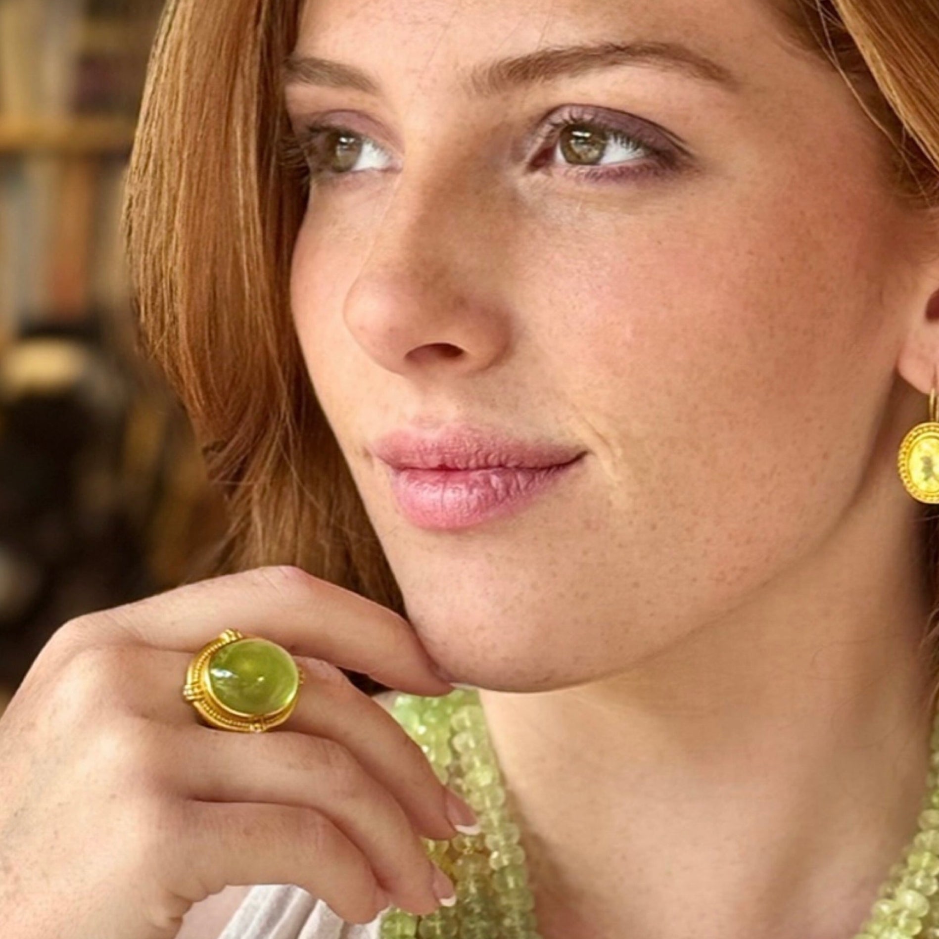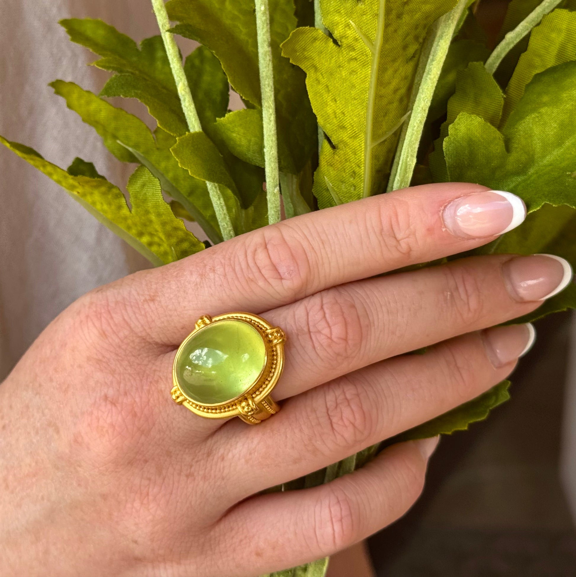 A large, misty green 28.5 carat Australian Prehnite cabochon makes a mesmerizing centerpiece for the classic Edwardian-style "Scuba" setting. This gorgeous ring, hand-rendered in buttery matte-finish 22k gold, is fit for a queen, at a US size 8 (may be sized up or down two sizes, with a discreetly visible sizing bar in back). One of a kind, and cannot be reproduced, but it may be ordered in moonstone or labradorite.