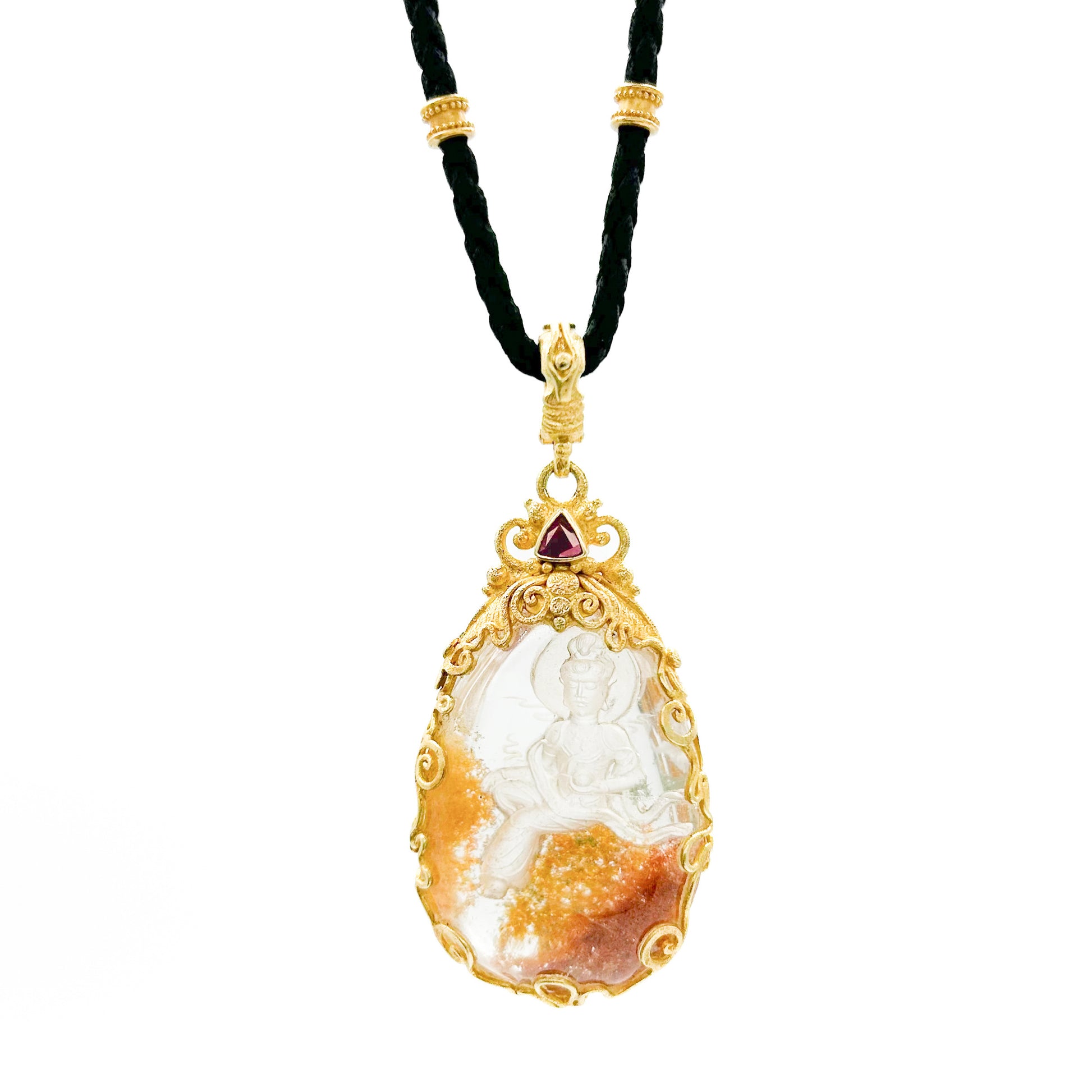 Introducing the "Seat of Heaven" pendant, a celestial masterpiece that fuses a natural crystalline treasure with divine craftsmanship. This exquisite piece features a 137 carat quartz crystal, intricately carved to reveal a meditative Buddha, its translucent depths enriched with iron inclusions that shimmer suggest Asian landscapes. At its apex, a .30 carat faceted pear-shaped ruby glitters with crimson hues, a perfect contrast to the quartz’s ethereal clarity. Encased in a 22K etched and granulated gold setting, the pendant’s ornate design evokes ancient artistry, while the hinged 18K gold clasp accommodates chains (shown on model) or cords up to 4mm in diameter. The reverse showcases the quartz’s natural beauty, framed by swirling gold filigree, making the Seat of Heaven a truly transcendent treasure for the soulful wearer.