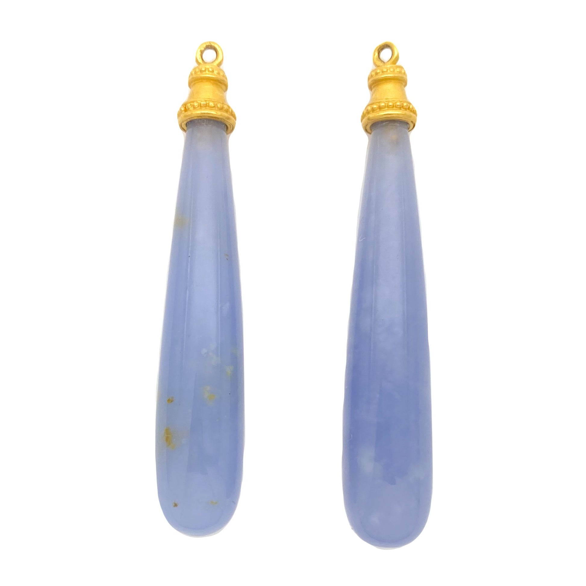 These elegant "Simple Cap" earring charms are crafted in 18K and 22K gold featuring 49.14 carats of sleek Holly Blue briolette agates, approximately 5cm (2") in length. These drops are the perfect complement for E-8526 Konstantin Earrings with matching blue agate center stones (shown on model). These "universal periwinkle"-hued drops also look great on a pair of our Honey Flower Hook or Sharon Slice earrings, and complement any color outfit!