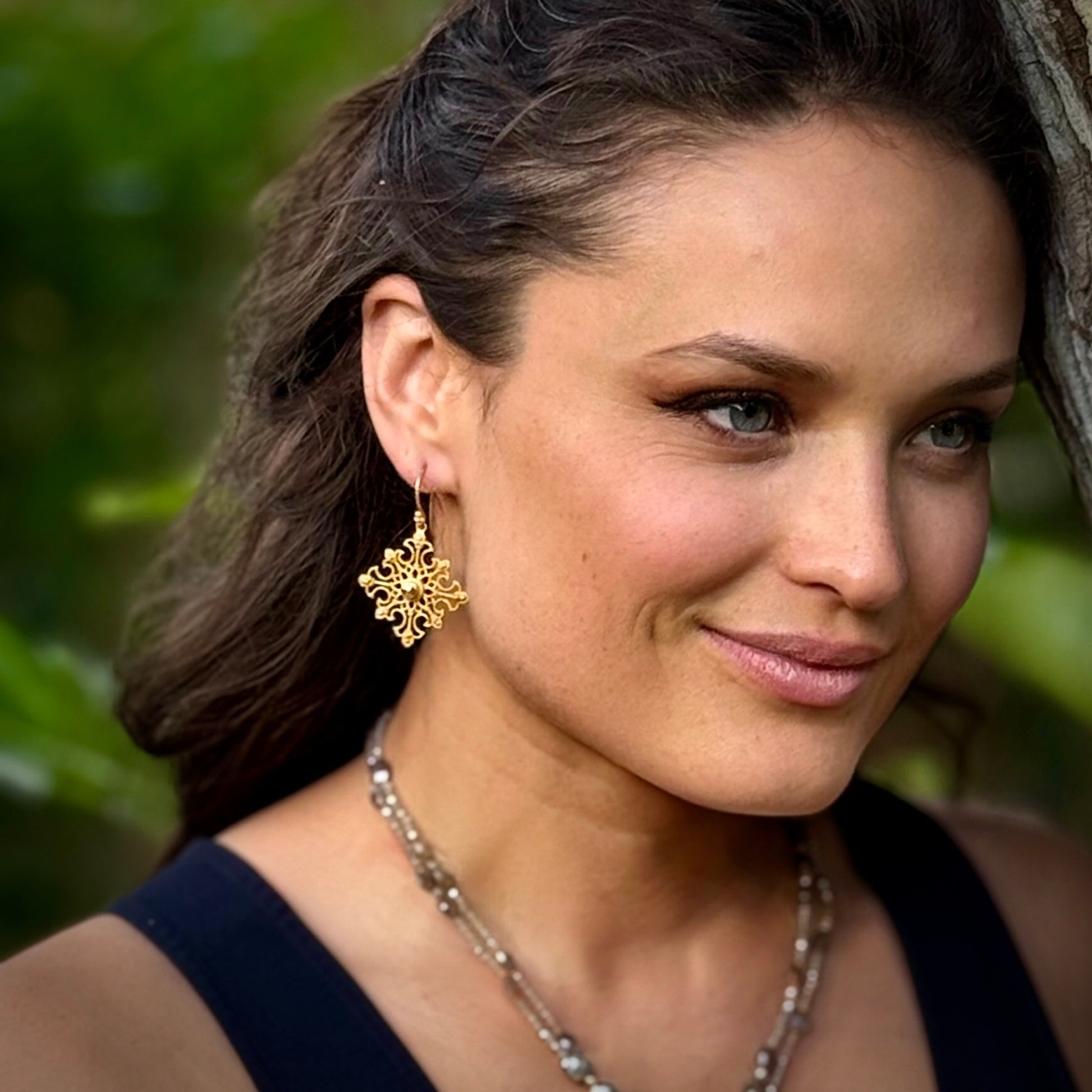 Capture winter’s delicate charm with these hand-fabricated 18k matte gold "Snowflake" earrings. Their lacy filigree design mimic the fascinating sacred geometry of intricate snowflakes, set with 1 carat of champagne rose-cut Cambodian zircons that glimmer softly. Lightweight hooks ensure easy wear for any occasion. These are the small version (approx. 1.25"). Also available in medium and large. A bit of low-key elegance for every day wear.